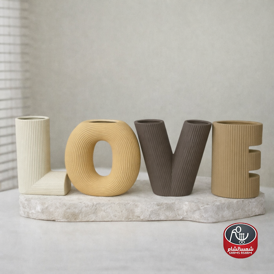 طقم فازات ديكور سيراميك بتصميم حروف LOVE – 4 قطع بألوان ترابية أنيقة، مثالي لتزيين الطاولة أو الرفوف ويضيف لمسة دافئة مودرن للمنزل.