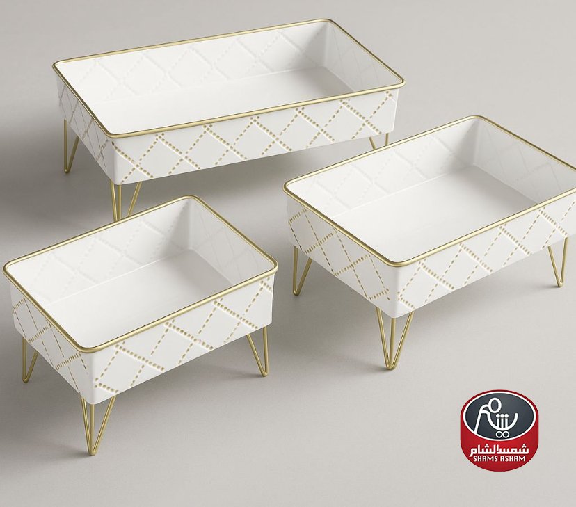 طقم أوعية تقديم معدنية أنيقة على قواعد ذهبية – 3 قطع