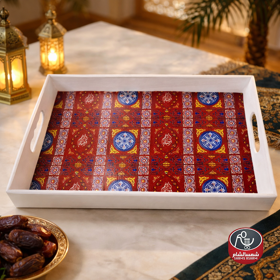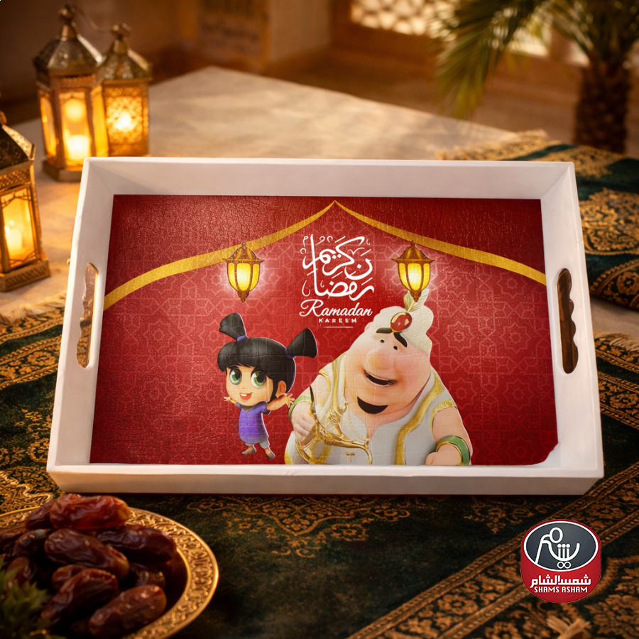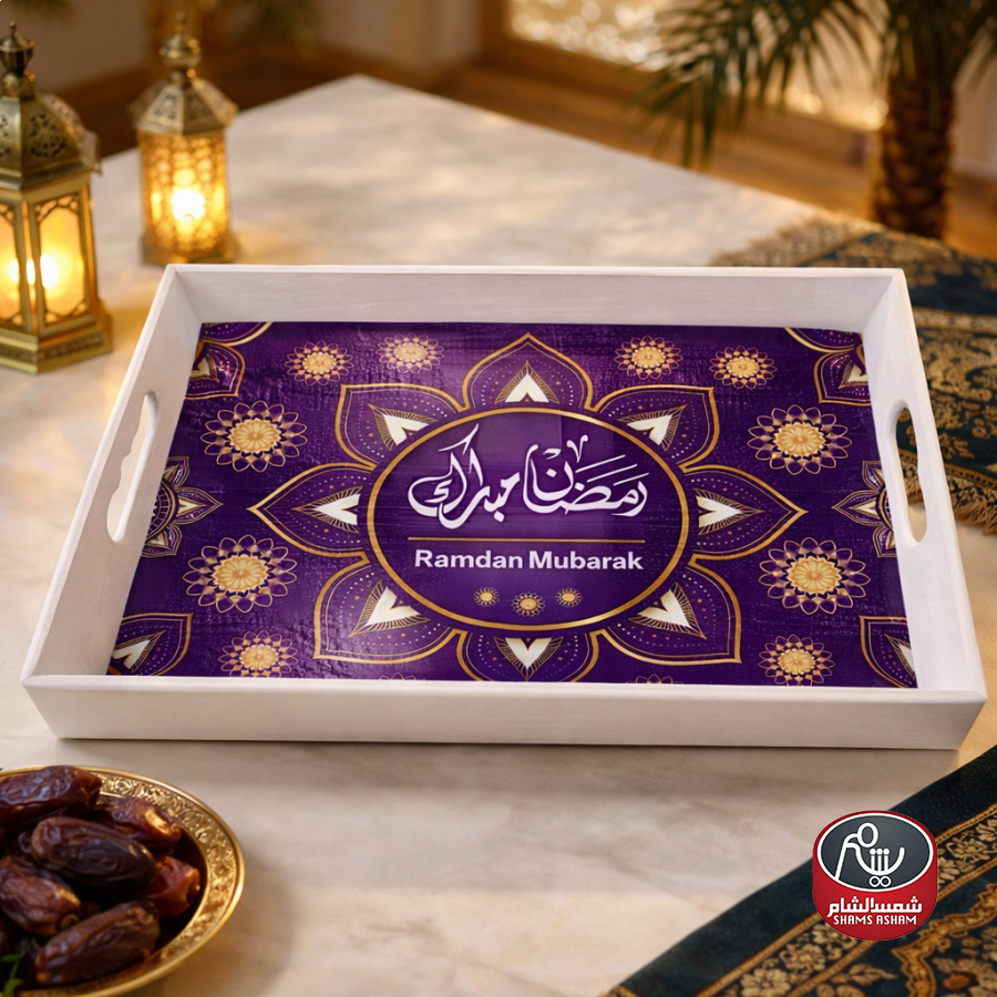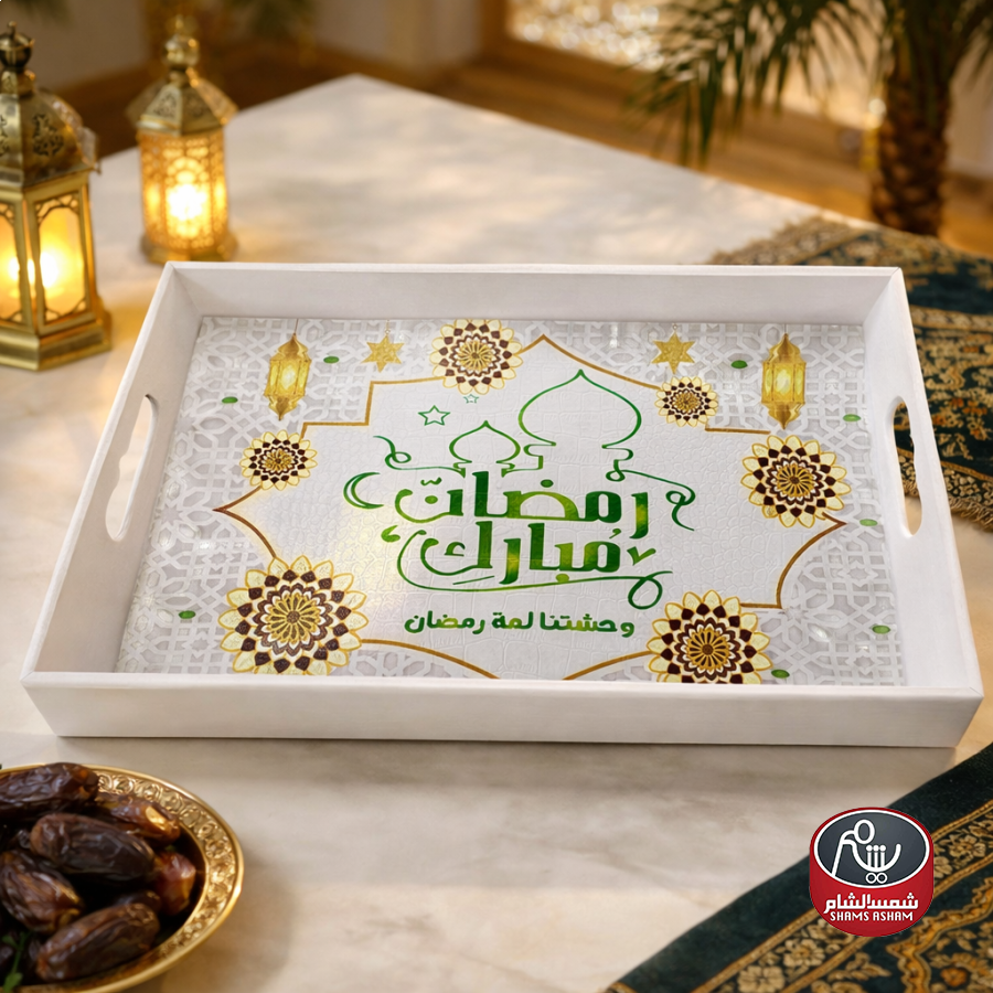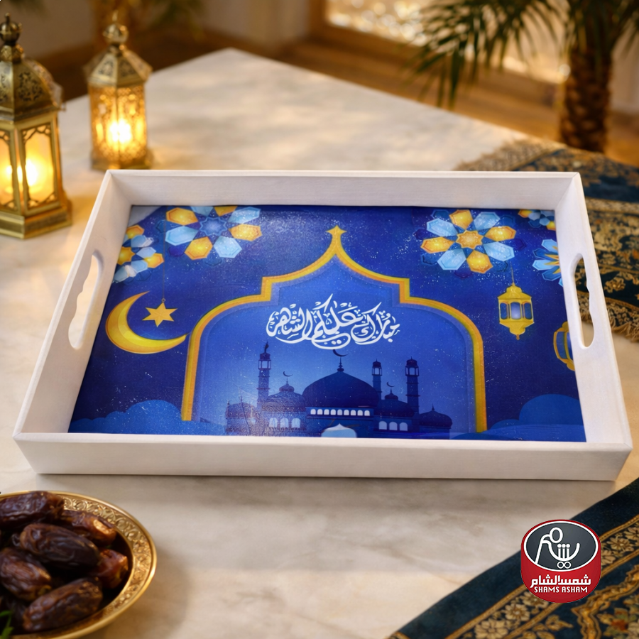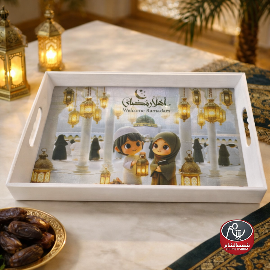 صينية تقديم أنيقة بتصميم رمضاني دافئ، مصنوعة من خامة متينة وبإطار أبيض عملي، مزينة برسمة رمضانية لطيفة مع فوانيس ولمسات ذهبية تضفي أجواء روحانية مميزة. مثالية لتقديم التمر، الحلويات أو القهوة خلال شهر رمضان، وتناسب الاستخدام اليومي أو الضيافة بشكل أنيق