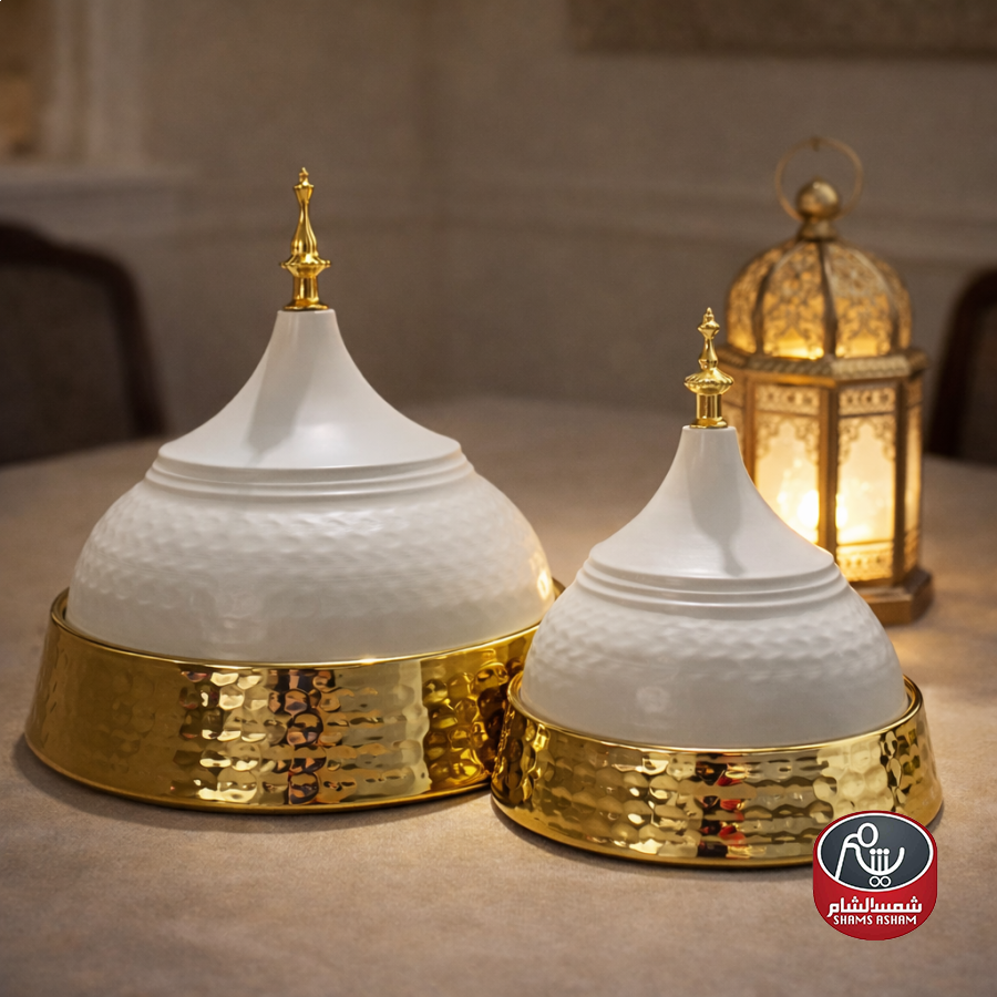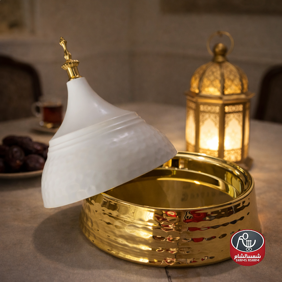 مضيفة معدنية أنيقة بتصميم رمضاني راقٍ وغطاء مزخرف يضفي لمسة فخامة مميزة على طاولة الضيافة. مثالية لتقديم التمر والحلويات، وتناسب أجواء رمضان والضيافة اليومية، كما تُعد خيارًا جميلًا للهدايا.