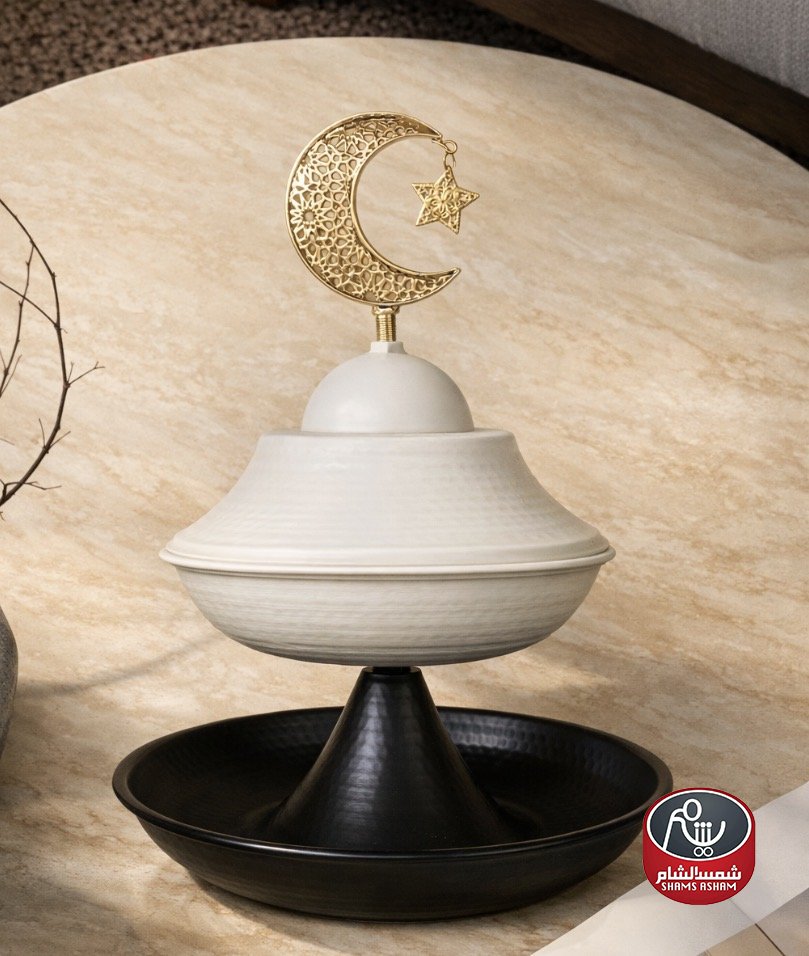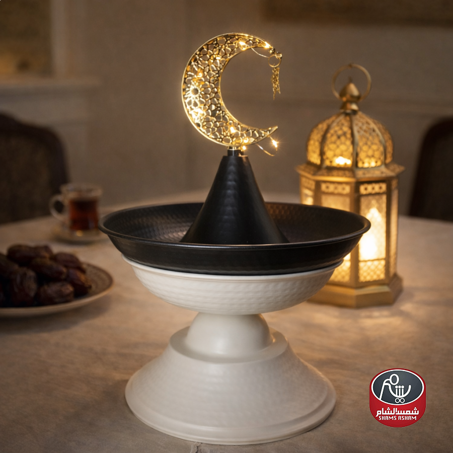 مضيفة هلال بتصميم أنيق وإضاءة دافئة تضيف أجواء رمضانية مميزة على طاولة الضيافة. مثالية لتقديم التمر أو الحلويات، وتجمع بين الوظيفة والديكور بأسلوب راقٍ.