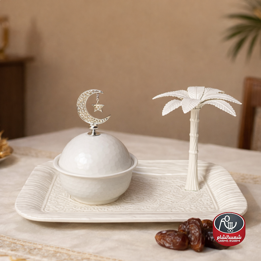 طقم أنيق مستوحى من الأجواء الرمضانية، يتكوّن من صينية تقديم مزخرفة مع مضيفة تمر بغطاء على شكل قُبّة مزينة بهلال، مع قطعة ديكور نخلة تضيف لمسة فخمة على طاولة الضيافة. مثالي لتقديم التمر والحلويات في رمضان والمناسبات الخاصة.