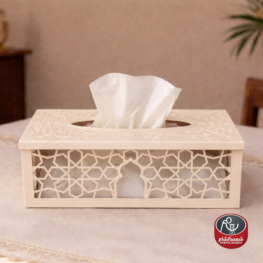 علبة محارم مصنوعة من المعدن بتصميم هندسي مستوحى من الزخارف الإسلامية، بلون أبيض أنيق ينسجم مع مختلف الديكورات. مناسبة لطاولة الضيافة وغرف المعيشة، وتضيف لمسة راقية خصوصاً في الأجواء الرمضانية.