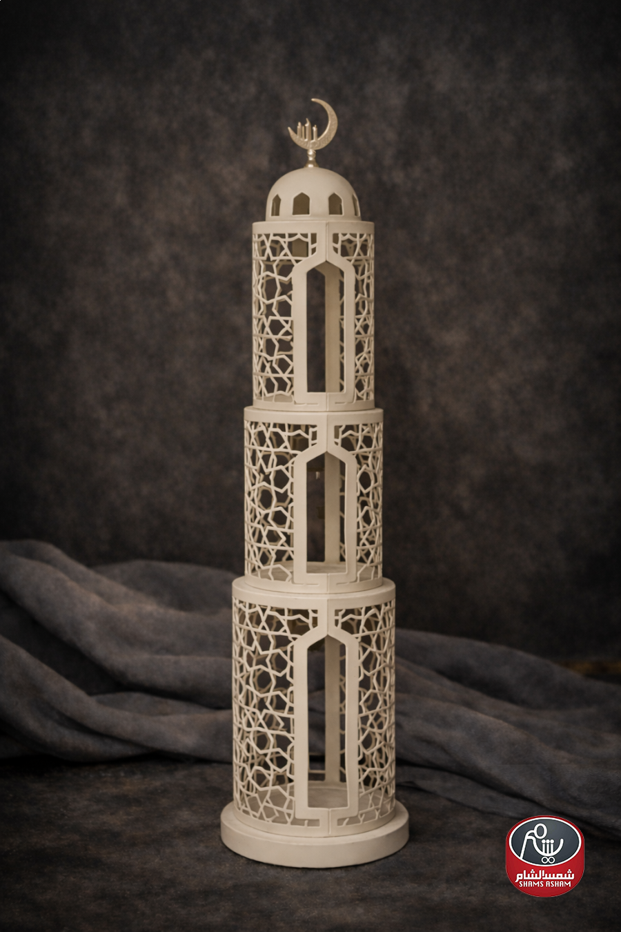 مجسّم ديكوري معدني بثلاث طبقات بتصميم إسلامي أنيق، مزخرف بنقوش هندسية مستوحاة من العمارة الإسلامية، مع قبة علوية وهلال ذهبي يضيف لمسة فخامة مميزة. مثالي للديكور الرمضاني، زوايا المنزل أو المداخل، ويعطي حضوراً راقياً بدون إضاءة داخلية.