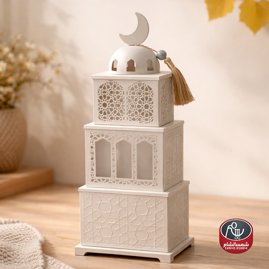 مضيفة ديكور بطبقات بتصميم إسلامي أنيق، مصنوعة بلون أبيض راقٍ مع نقوش دقيقة تعكس الإضاءة بشكل دافئ ومريح. مثالية للضيافة الرمضانية، الطاولات الجانبية وزوايا الاستقبال، وتضيف لمسة فخامة وهدوء لأي مكان. مناسبة للاستخدام مع الشموع أو كقطعة ديكور مستقلة