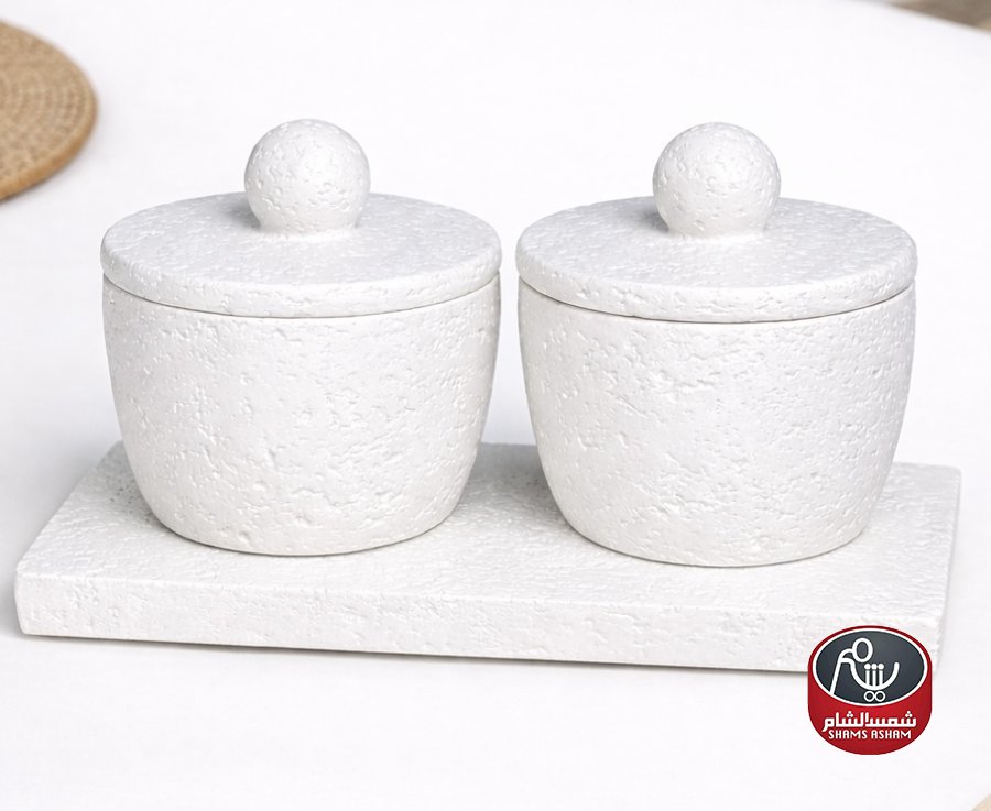طقم حجري قطعتين مع قاعدة، بتصميم بسيط وأنيق بلمسة حجرية ناعمة، مثالي لتقديم السكر، البن أو الحلويات الصغيرة. يناسب طاولة القهوة والسفرة ويضيف لمسة ترتيب وفخامة للديكور العصري والكلاسيك.