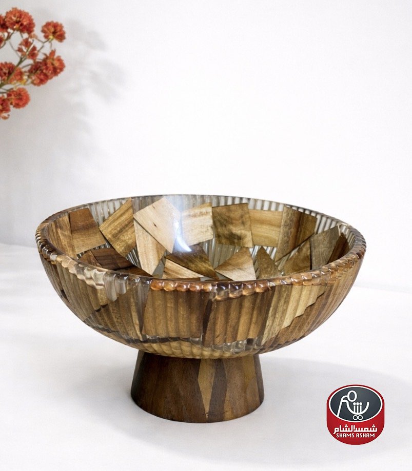 جاط فواكه بتصميم مودرن أنيق، مصنوع من الأكريلك الشفاف مع قاعدة خشبية طبيعية تضيف لمسة دافئة على طاولة التقديم. مثالي لتقديم الفواكه، الحلويات أو الشوكولاتة بأسلوب راقٍ ومرتب. الارتفاع 18 سم، القطر 25 سم.