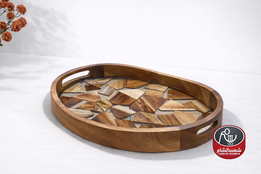 صينية تقديم بتصميم أنيق تجمع بين إطار خشبي طبيعي وقاعدة أكريلك شفافة مع تفاصيل خشبية عصرية. مثالية لتقديم القهوة، المشروبات أو الضيافة بأسلوب راقٍ. المقاس 38 × 28 سم.