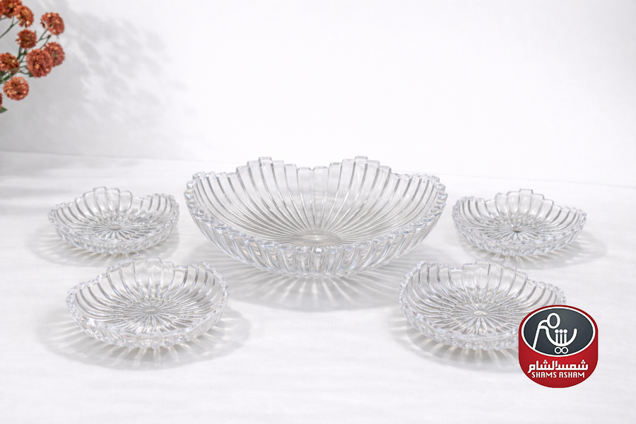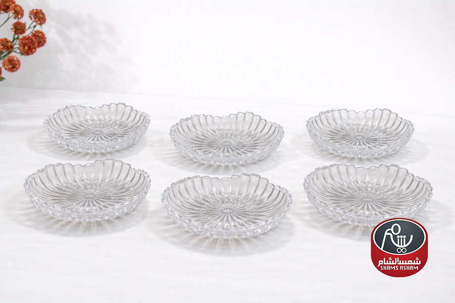 طقم تقديم فاخر من الزجاج الشفاف بتصميم أنيق ولمسة عصرية، يضم جاط رئيسي و6 صحون متناسقة. مثالي لتقديم الحلويات، الفواكه أو الضيافة بأسلوب راقٍ يزيّن سفرتك.