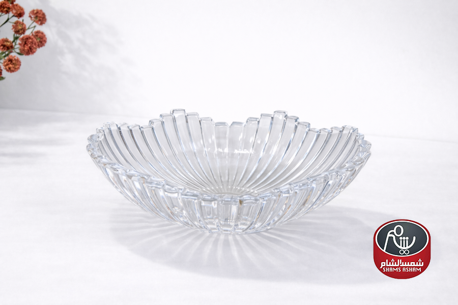 جاط تقديم أنيق مصنوع من الزجاج بتصميم دائري مزخرف بنقشة شعاعية جذابة، يضفي لمسة راقية على طاولة الضيافة. مناسب لتقديم الفواكه أو الحلويات أو المكسرات، ويتميّز بحواف بارزة تعكس الضوء بشكل جميل. قطر ٢٧ سم