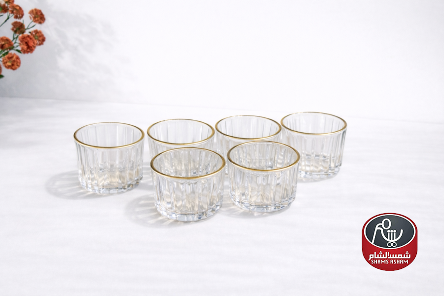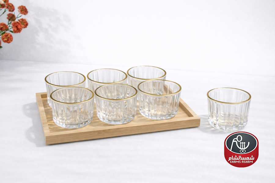 طقم تقديم مكسرات بتصميم أنيق يجمع بين الزجاج الشفاف بلمسة ذهبية وصينية خشب طبيعية تضيف طابعًا دافئًا وراقيًا. مثالي لتقديم المكسرات، الحلويات الصغيرة، أو المقبلات بأسلوب مرتب وجذاب، مناسب للضيافة اليومية والجلسات المميزة.