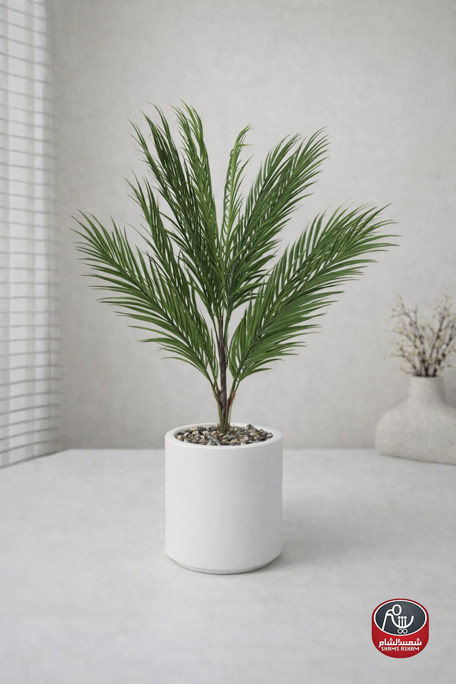 قطعة ديكور بارتفاع 65 سم تضيف لمسة طبيعية هادئة وأنيقة لأي مساحة. تتميز بأوراق نخيل واقعية داخل أصيص أبيض بسيط يناسب الديكورات العصرية. مثالية للمكاتب، الطاولات الجانبية، أو رفوف المنزل، مع مظهر دائم دون الحاجة للعناية