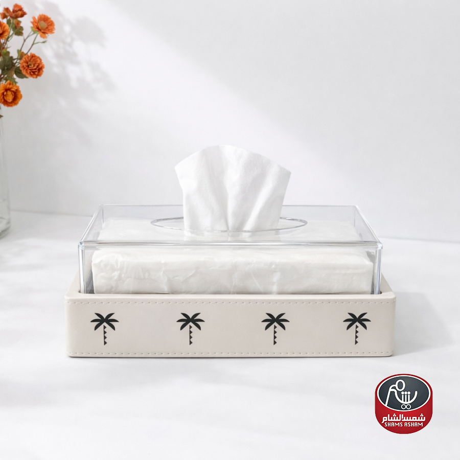 علبة محارم أنيقة بتصميم عصري، مصنوعة من الجلد من الخارج مع غطاء أكريليك شفاف يبرز شكل المحارم بشكل مرتب وفخم.