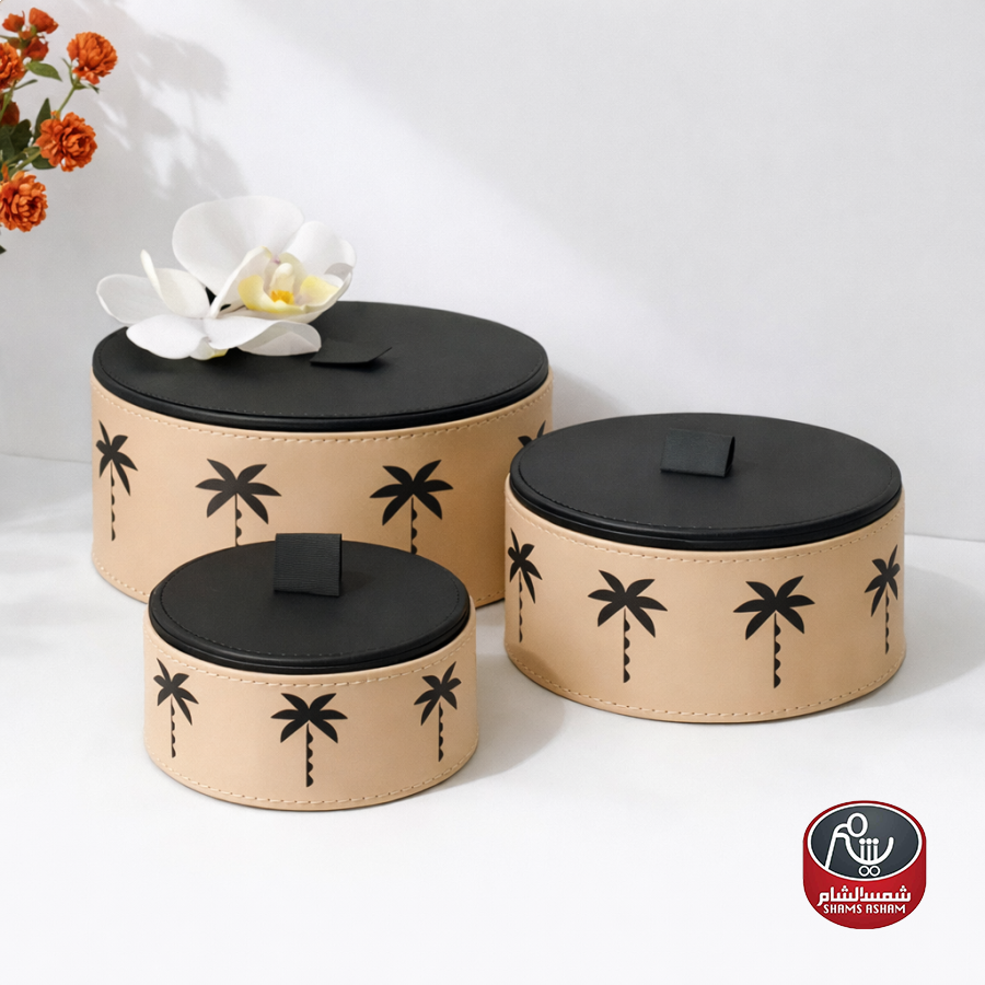 طقم علب تخزين أنيقة بتصميم عصري فاخر، مصنوعة من الجلد من الخارج مع أغطية متناسقة، مزينة بنقشة نخيل تضيف لمسة راقية لديكور المنزل.