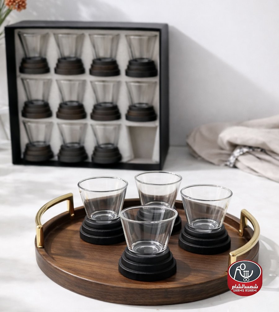 طقم فاخر يضم ١٢ فنجان زجاج شفاف مع قواعد سوداء بتصميم راقٍ، مثالي لتقديم القهوة بأسلوب أنيق ومرتب.