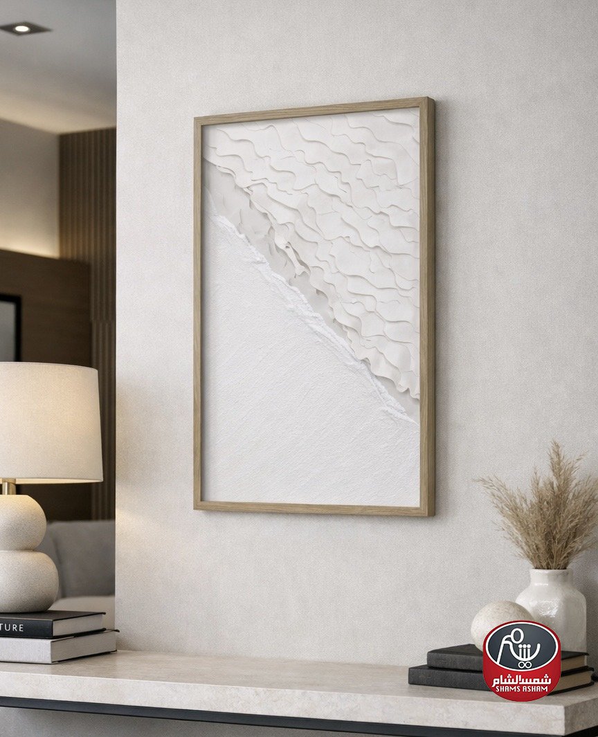لوحة حائط فنية بتصميم تجريدي أنيق بالكامل بدرجات الأبيض، تتميز بتفاصيل بارزة تضيف عمقاً وإحساساً راقياً بالهدوء والنقاء. خيار مثالي لعشّاق الديكور المودرن والستايل المينيمال، حيث تنسجم بسهولة مع مختلف الألوان والمساحات وتمنح المكان لمسة فخامة ناعمة. الإطار الخشبي يعزز الدفء والأناقة.