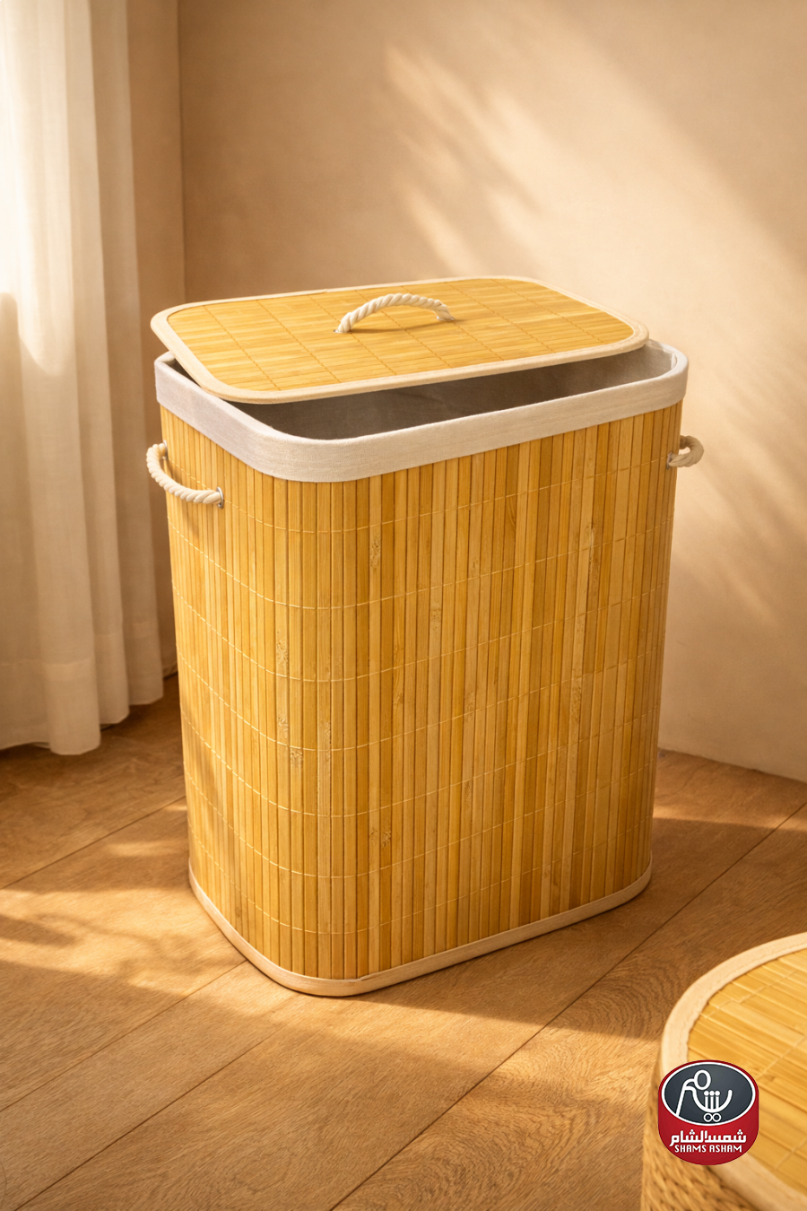 مصنوعة من البامبو الطبيعي بتصميم أنيق يناسب الديكورات العصرية. مزودة بغطاء عملي ومقابض جانبية لسهولة الحمل، مع بطانة داخلية قماشية قابلة للإزالة والتنظيف. مثالية لتنظيم الغسيل أو التخزين بشكل مرتب وجمالي.