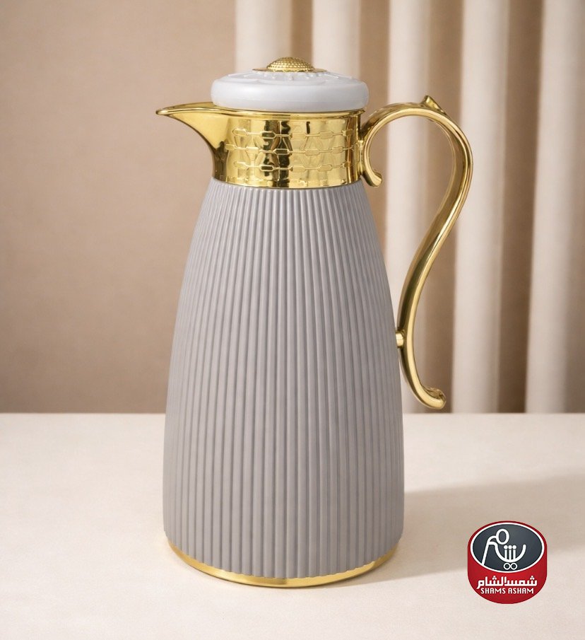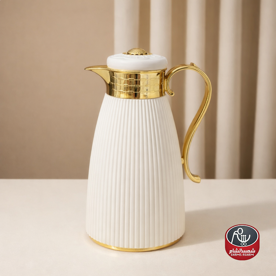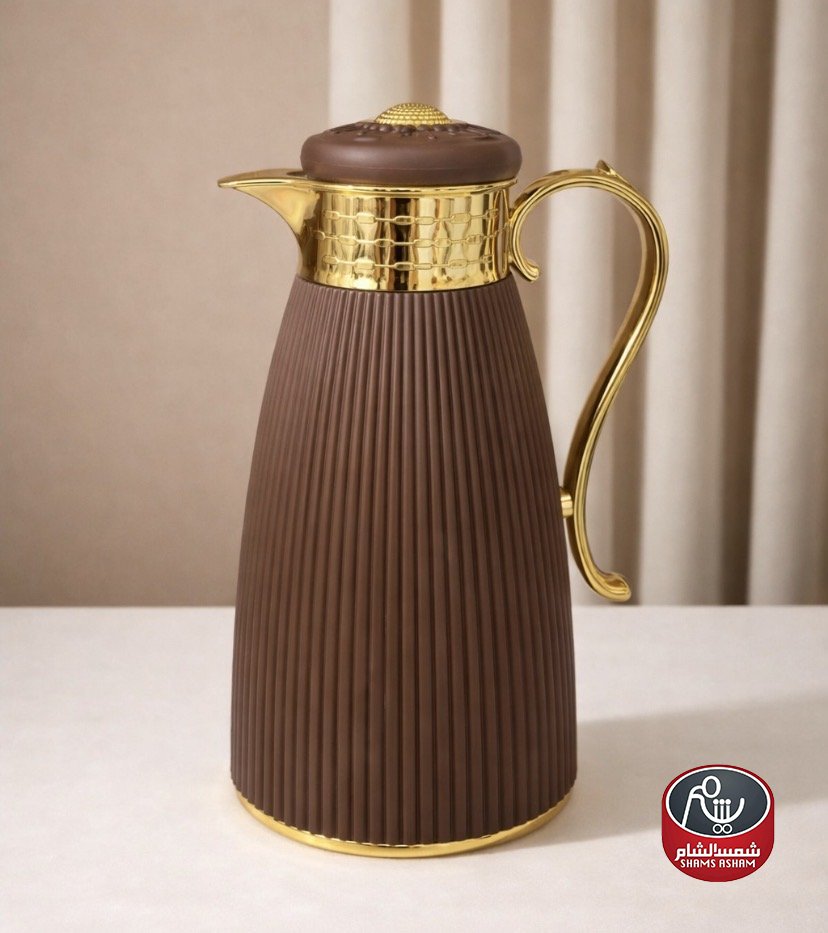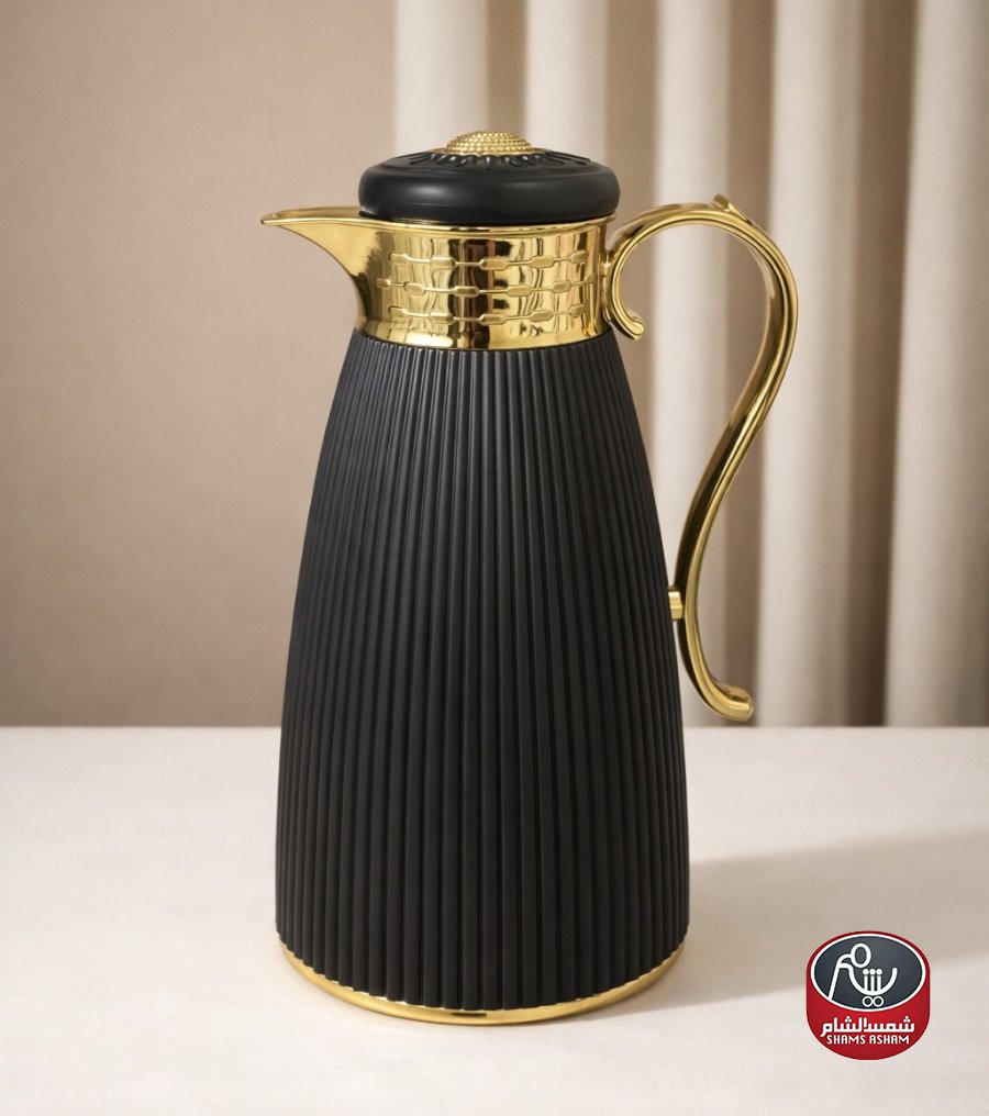 ثيرموس قهوة أنيق بتصميم عصري وتفاصيل ذهبية فخمة، يحافظ على حرارة القهوة لساعات طويلة بفضل العزل الحراري الممتاز. سعة 1 لتر، مثالي للضيافة والاستخدام اليومي