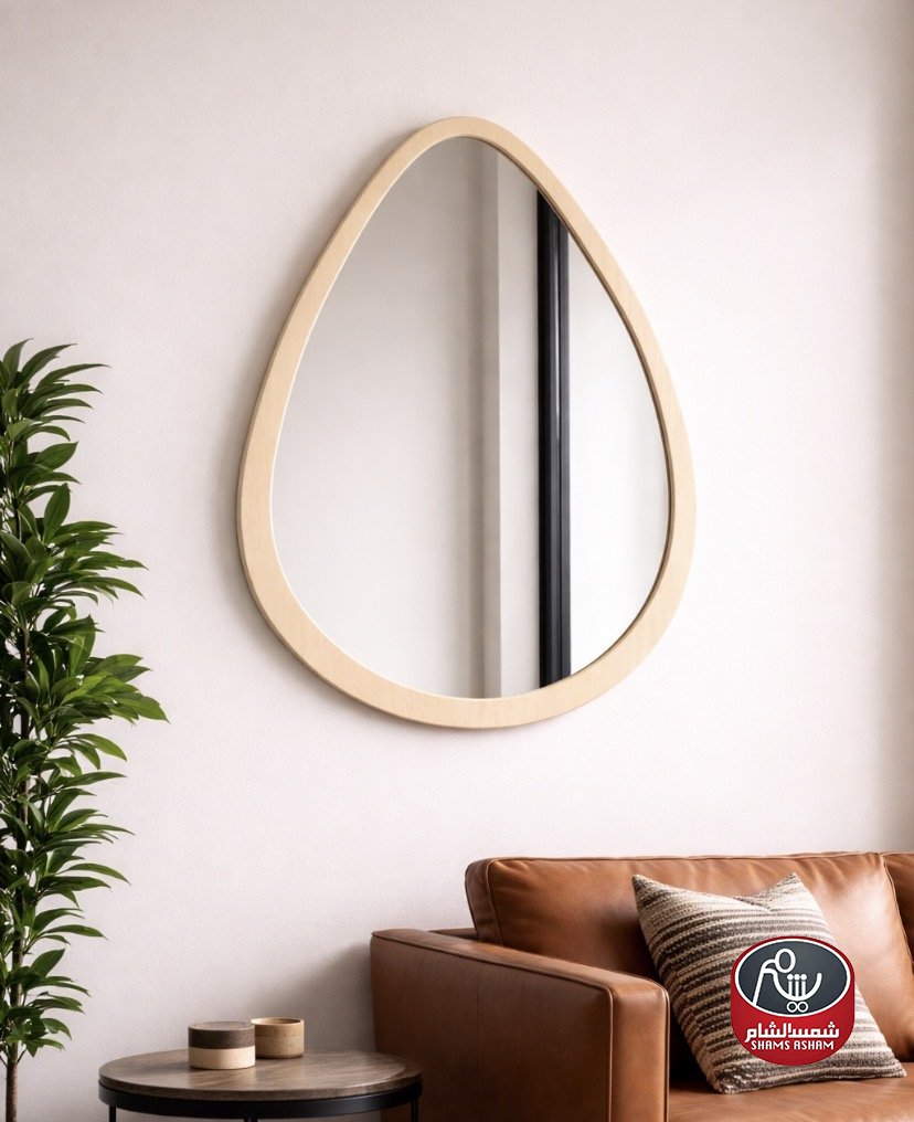 مرآة بتصميم عضوي عصري وإطار خشبي فاتح يضيف دفء وأناقة للمكان، مثالية لغرف المعيشة والمداخل وتنسجم مع الديكور المودرن والبسيط. شكلها المميز يمنح الجدار لمسة فنية ويعكس الإضاءة ليعطي إحساس بمساحة أوسع.