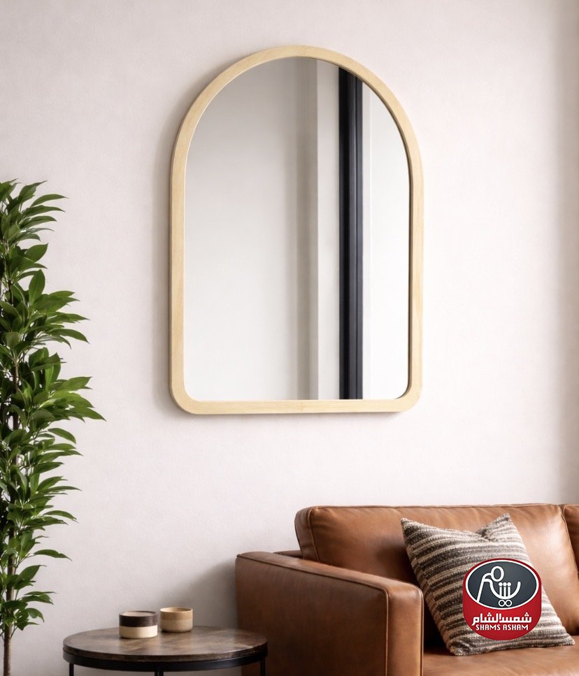 مرآة بقوس علوي بتصميم مودرن أنيق وإطار خشبي فاتح يضيف دفء ولمسة طبيعية للمكان. مناسبة لغرف المعيشة، المداخل وغرف النوم، وتنسجم بسهولة مع الديكور العصري والبسيط، كما تساعد على عكس الإضاءة ومنح إحساس بمساحة أوسع.