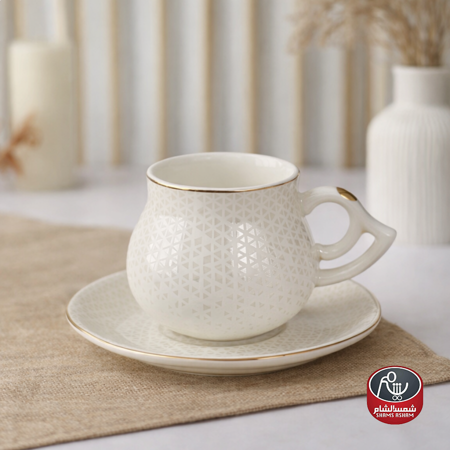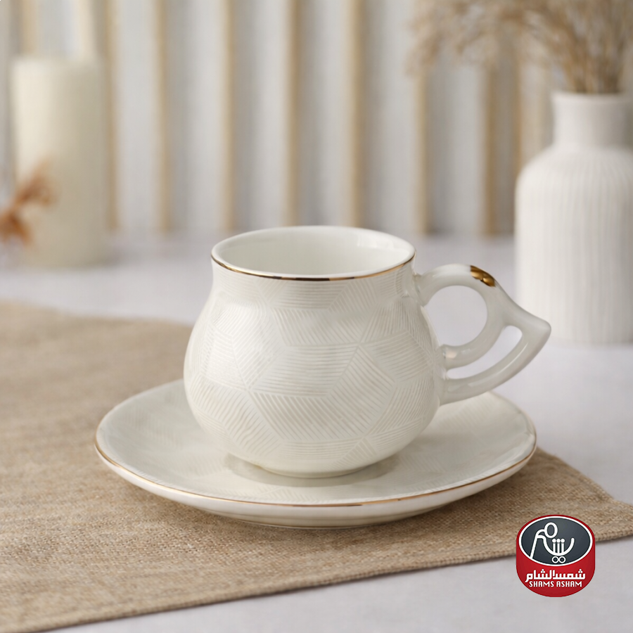 طقم فناجين قهوة أنيق مكوّن من 12 فنجان مع 12 صحن بتصميم هندسي ناعم ولمسة ذهبية راقية على الحواف. مصنوع من بورسلان عالي الجودة بلون أبيض أنيق يضفي فخامة على سفرة القهوة، مناسب لتقديم القهوة العربية أو التركية ويعد خياراً مثالياً للضيافة والاستخدام اليومي