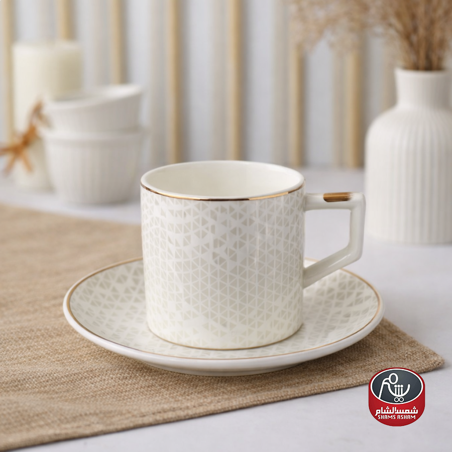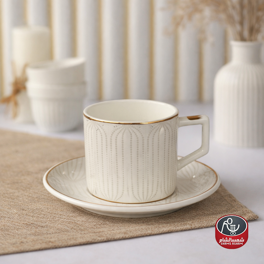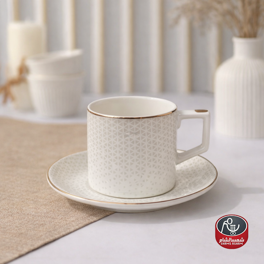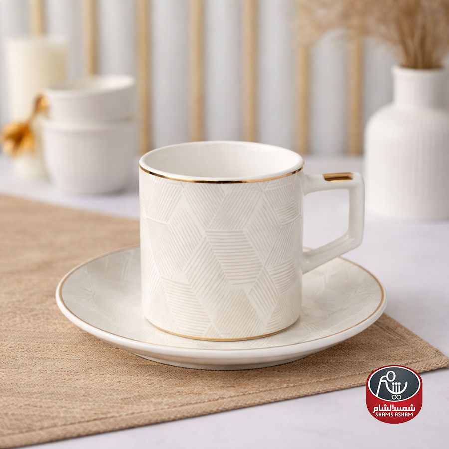 طقم فناجين قهوة أنيق مكوّن من 12 فنجان مع 12 صحن بتصميم هندسي ناعم ولمسة ذهبية راقية على الحواف. مصنوع من بورسلان عالي الجودة بلون أبيض أنيق يضفي فخامة على سفرة القهوة، مناسب لتقديم القهوة العربية أو التركية ويعد خياراً مثالياً للضيافة والاستخدام اليومي.