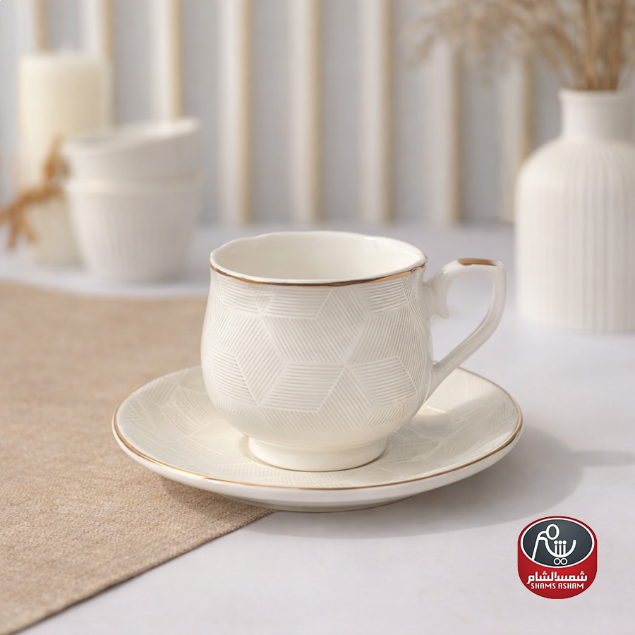 طقم فناجين قهوة أنيق مكوّن من 12 فنجان مع 12 صحن بتصميم هندسي ناعم ولمسة ذهبية راقية على الحواف. مصنوع من بورسلان عالي الجودة بلون أبيض أنيق يضفي فخامة على سفرة القهوة، مناسب لتقديم القهوة العربية أو التركية ويعد خياراً مثالياً للضيافة والاستخدام اليومي.