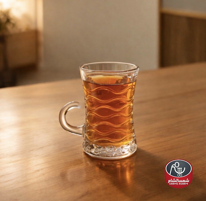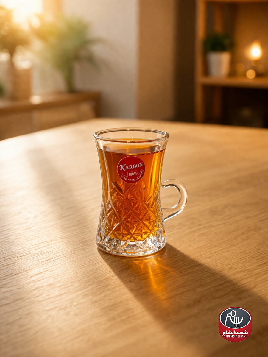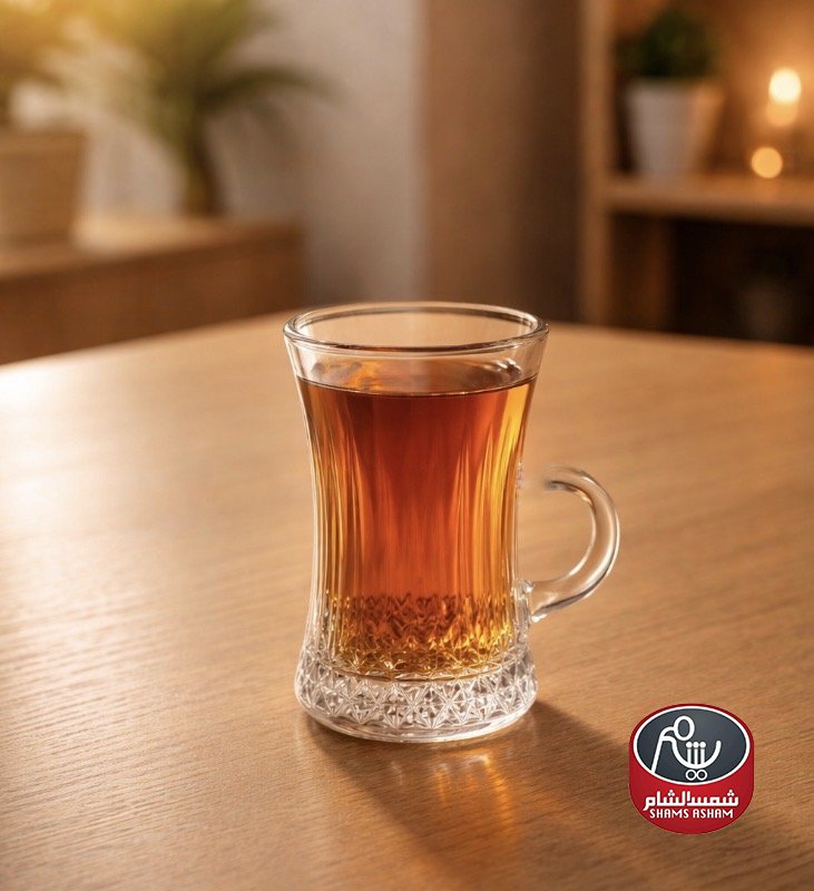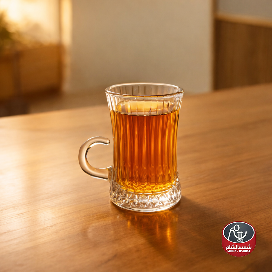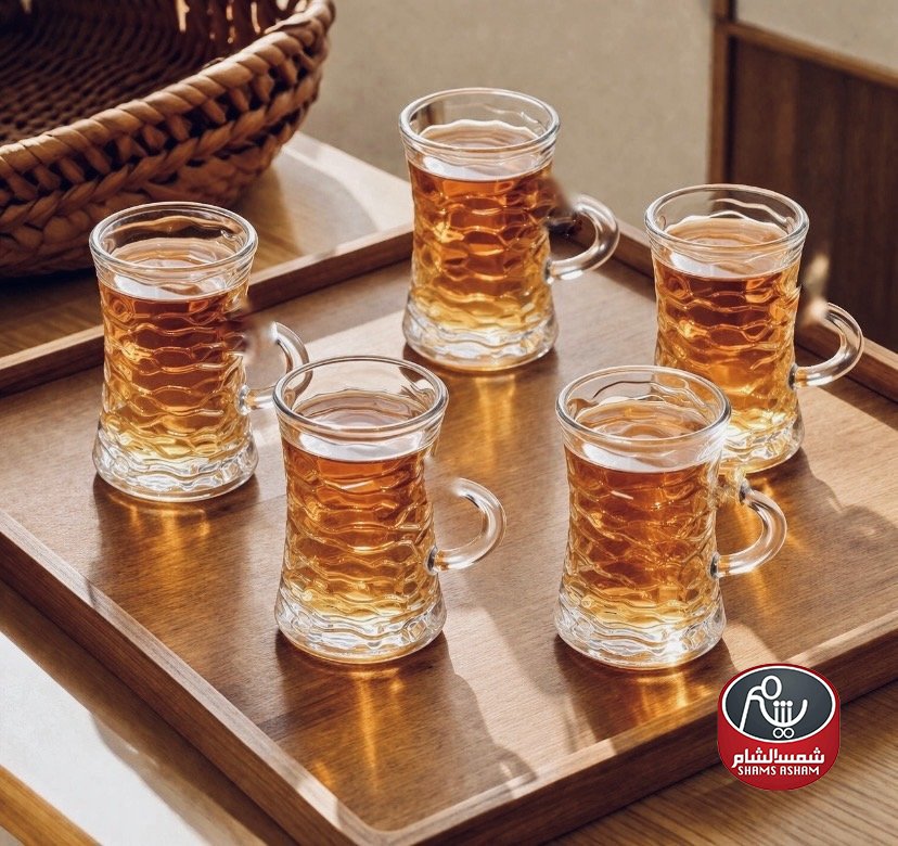 طقم كاسات شاي زجاج فاخر مكون من 6 قطع، تصميم أنيق بنقشة مميزة ولمعة شفافة تعطي لمسة فخامة على التقديم، مثالي للاستخدام اليومي والضيافة