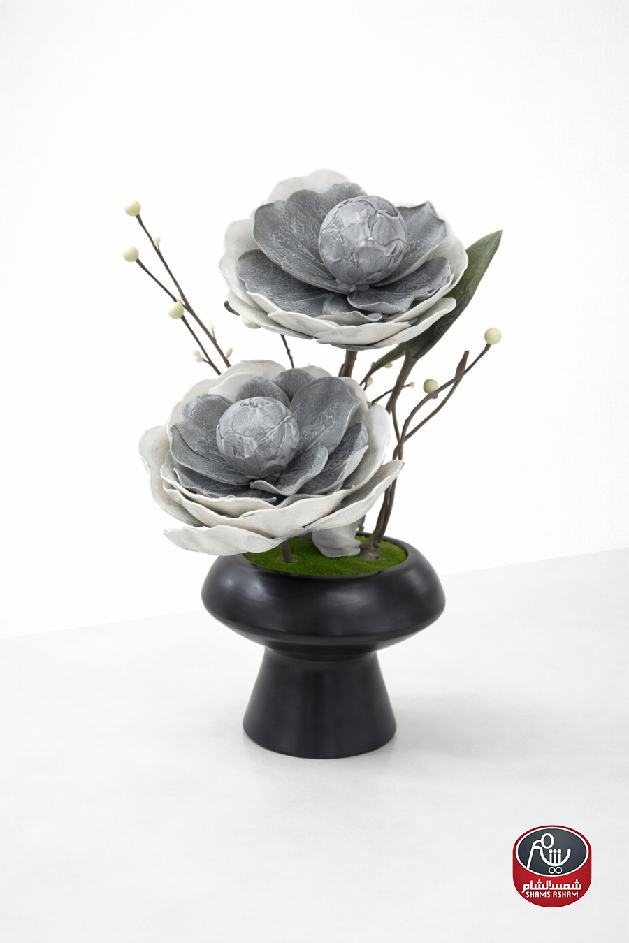 تنسيق أنيق من زهور البيوني الرمادية بتفاصيل ناعمة داخل فازة سوداء فخمة، يضيف لمسة عصرية وهادئة تناسب الديكورات الراقية