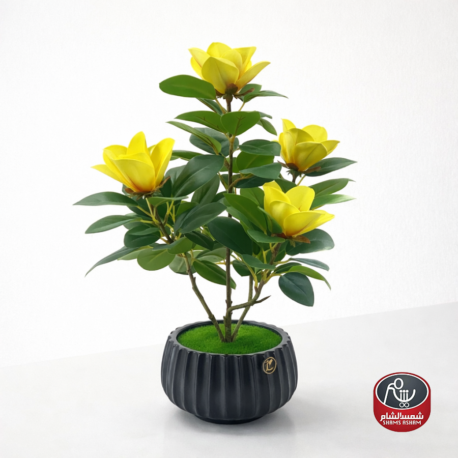 تنسيق جميل من زهور الماغنوليا الصفراء بأوراق خضراء كثيفة داخل فازة سوداء عصرية، يضيف لمسة إشراقة وحيوية لأي مكان في المنزل