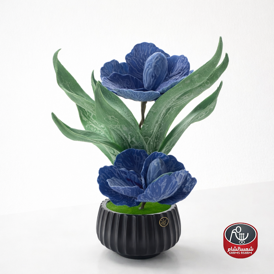 تنسيق مميز من زهور البيوني باللون الأزرق الغامق مع أوراق خضراء أنيقة داخل فازة سوداء عصرية، يضيف لمسة فخامة وجرأة للديكور