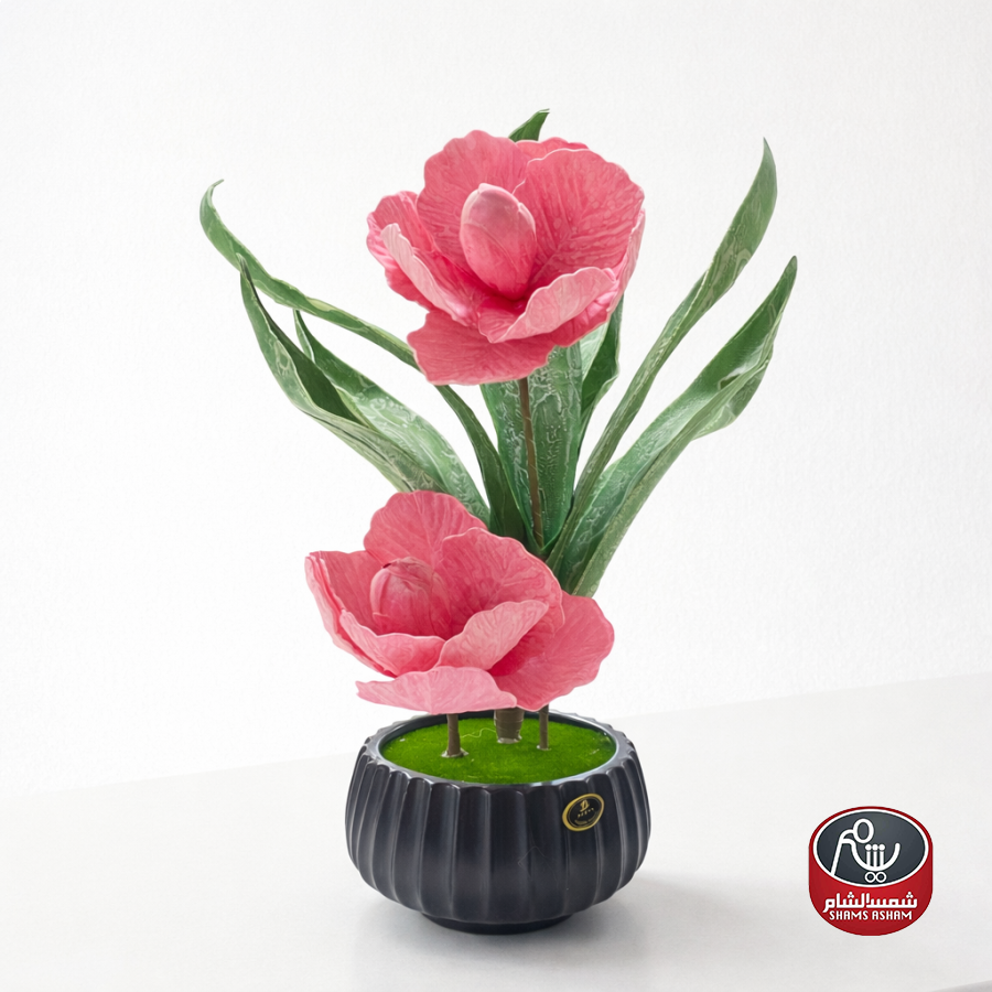 تنسيق أنيق من زهور البيوني الوردية الغامقة مع أوراق خضراء طويلة داخل فازة سوداء عصرية، يضيف لمسة فخمة وحيوية لأي زاوية في المنزل