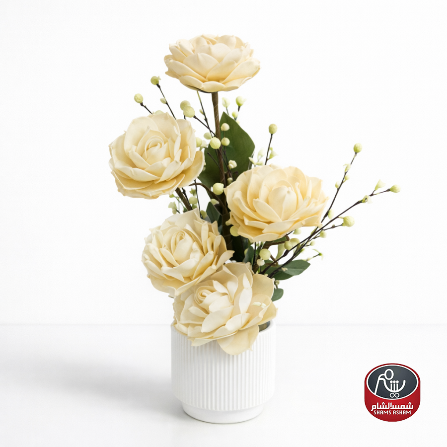تنسيق راقي من ورود الجوري بلون أوف وايت ناعم داخل فازة بيضاء عصرية، يضيف لمسة هدوء وأناقة تناسب جميع الديكورات