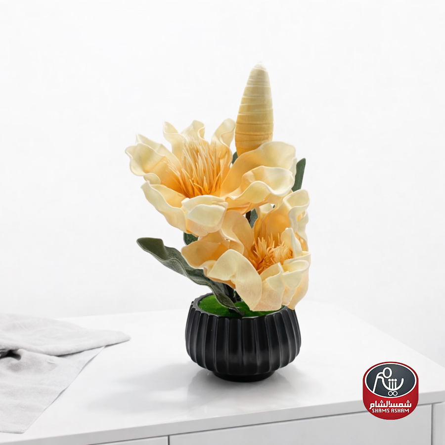 تنسيق أنيق من زهور اللوتس بلون خوخي ناعم مع تفاصيل داخلية مميزة داخل فازة سوداء عصرية، يضيف لمسة هدوء وفخامة لأي مساحة