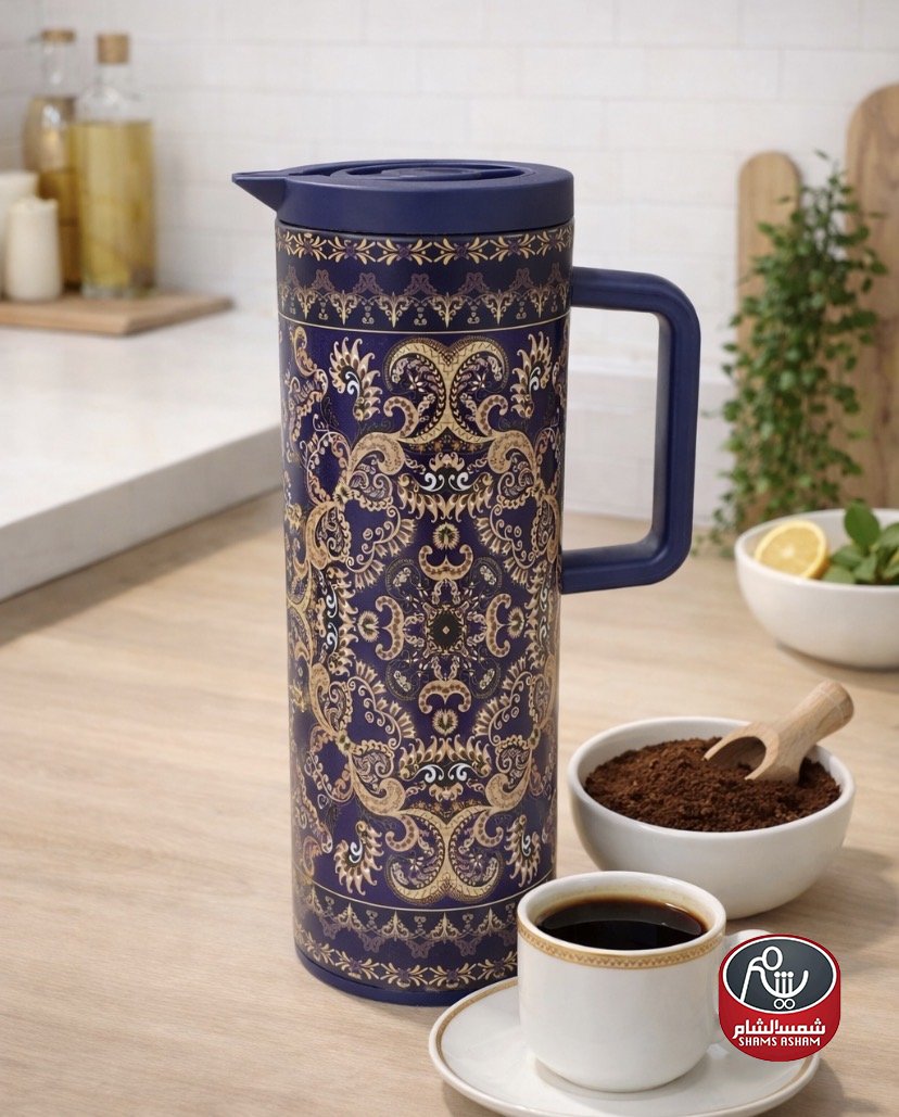 ثيرموس قهوة بتصميم تراثي فاخر بسعة 1 لتر، مثالي لتقديم القهوة العربية أو الشاي مع الحفاظ على الحرارة لأطول وقت، مصنوع بجودة عالية مع يد مريحة وسكب سهل بدون تنقيط، خيار مثالي للضيافة اليومية ويضيف لمسة فخامة وأناقة على طاولتك.