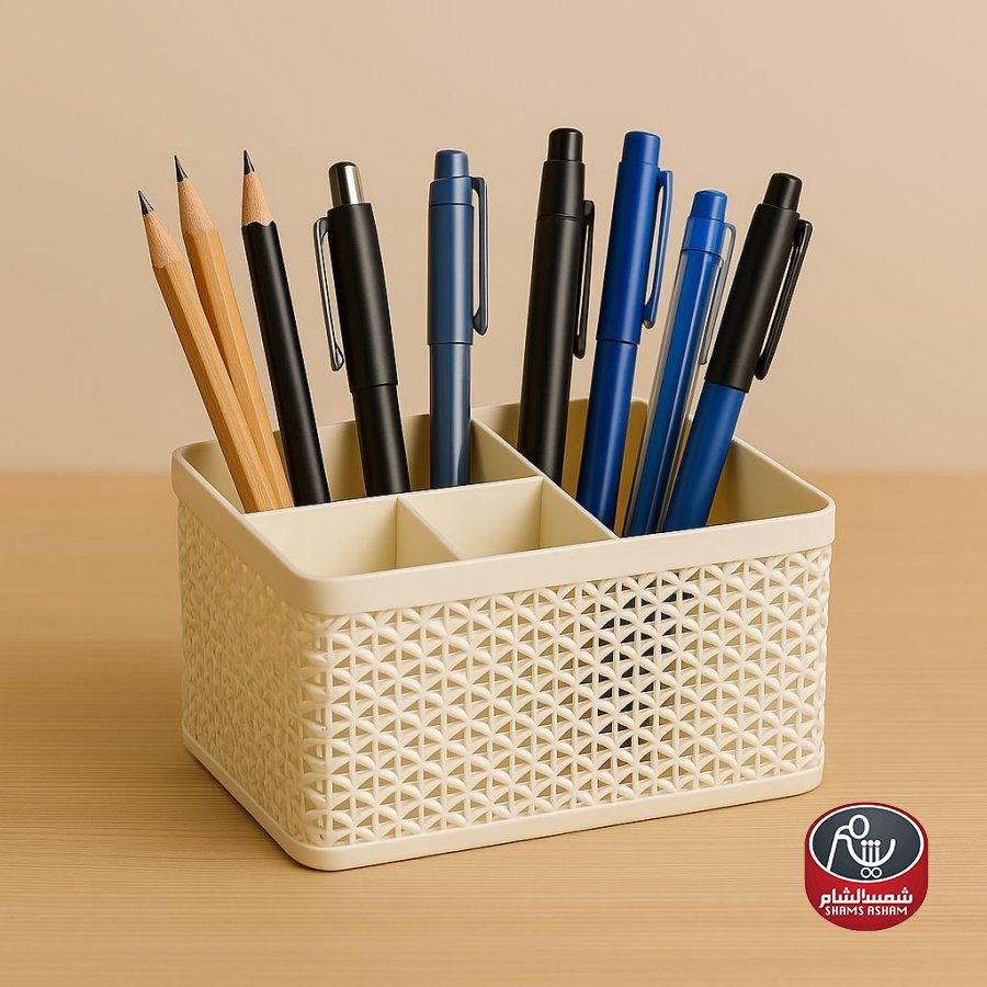 منظّم مكتبي بتصميم عملي وأنيق، يحتوي على عدة أقسام لتسهيل ترتيب الأقلام، الأقلام الرصاص، الأدوات المكتبية أو أدوات المكياج الصغيرة. مصنوع من بلاستيك متين ومزخرف بلمسة شبكية عصرية تضيف جمالية للمكتب أو التسريحة. مثالي لتنظيم المساحة والحفاظ على الأدوات في متناول اليد.