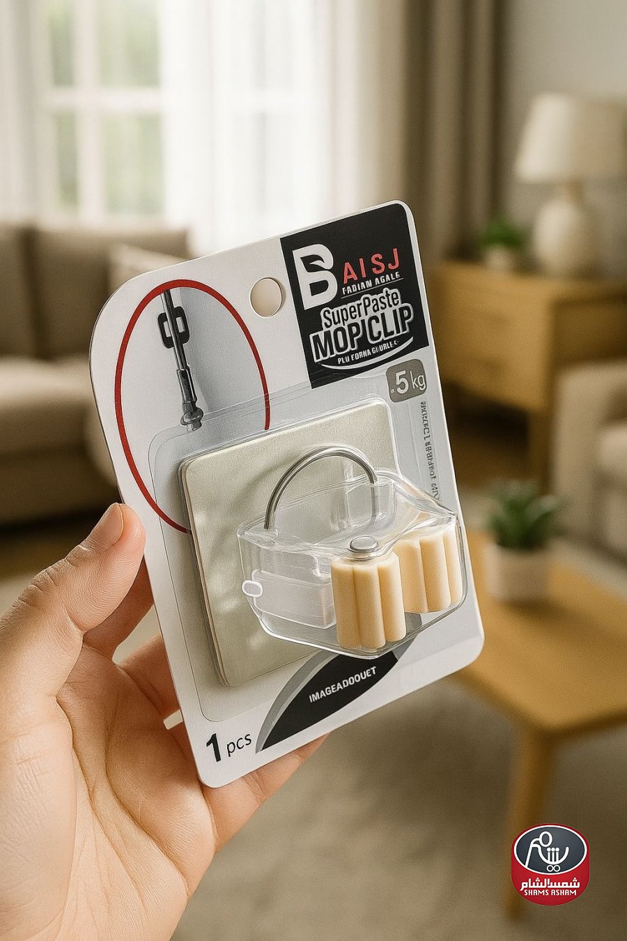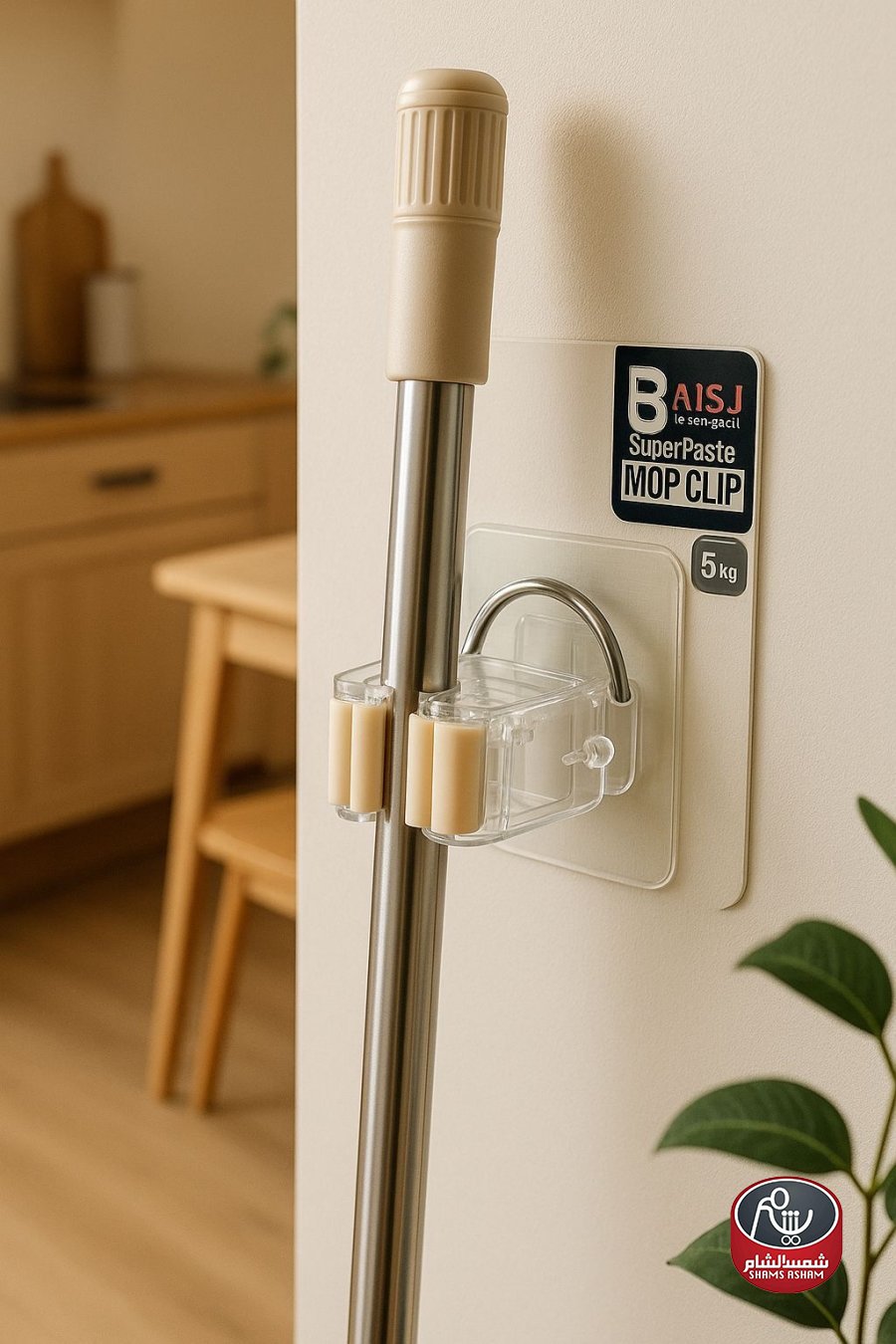 علاقة عملية تثبت على الحائط باستخدام لاصق قوي، مصممة لحمل مقابض الممسحة أو المكنسة بطريقة منظمة دون حفر. مزودة ببكرات مرنة تثبت المقبض بإحكام، وتتحمل وزن يصل حتى 5 كغم، مناسبة للاستخدام في المطبخ، الحمام، أو غرفة الغسيل.