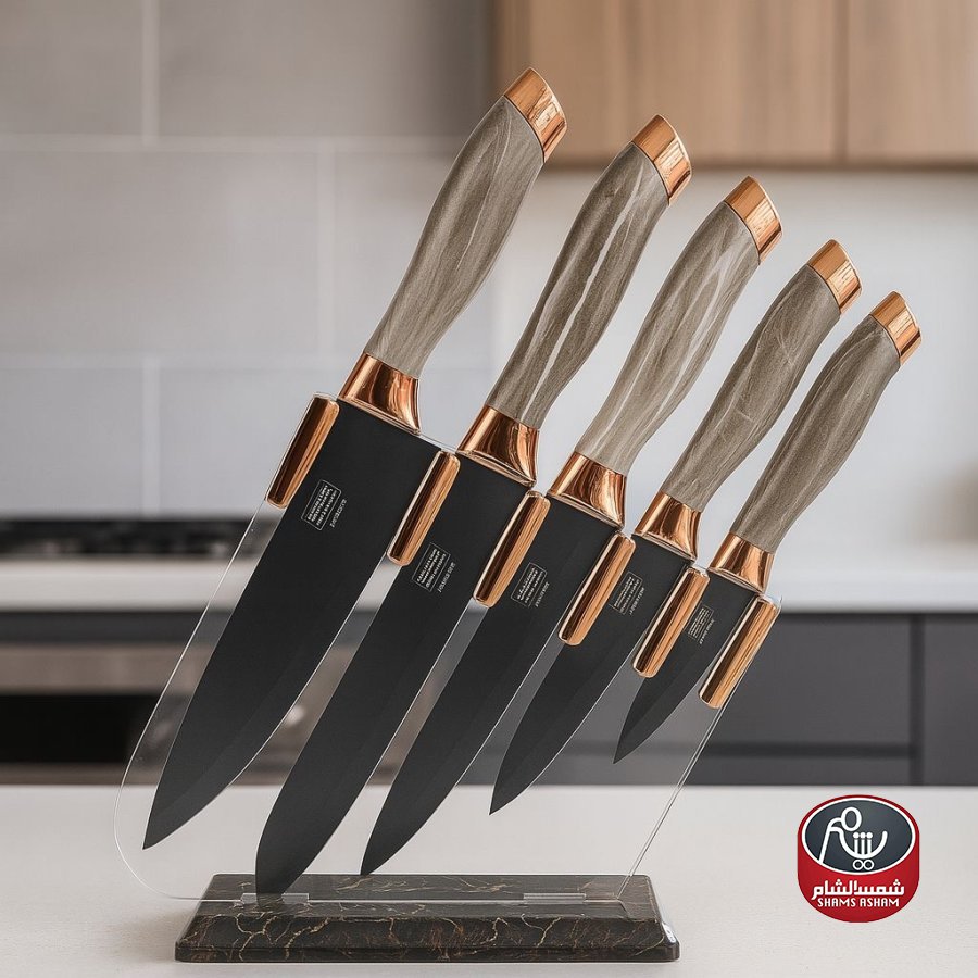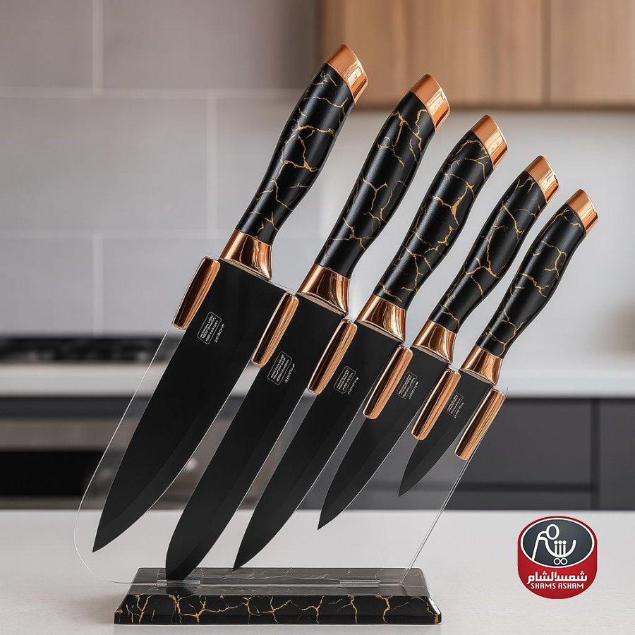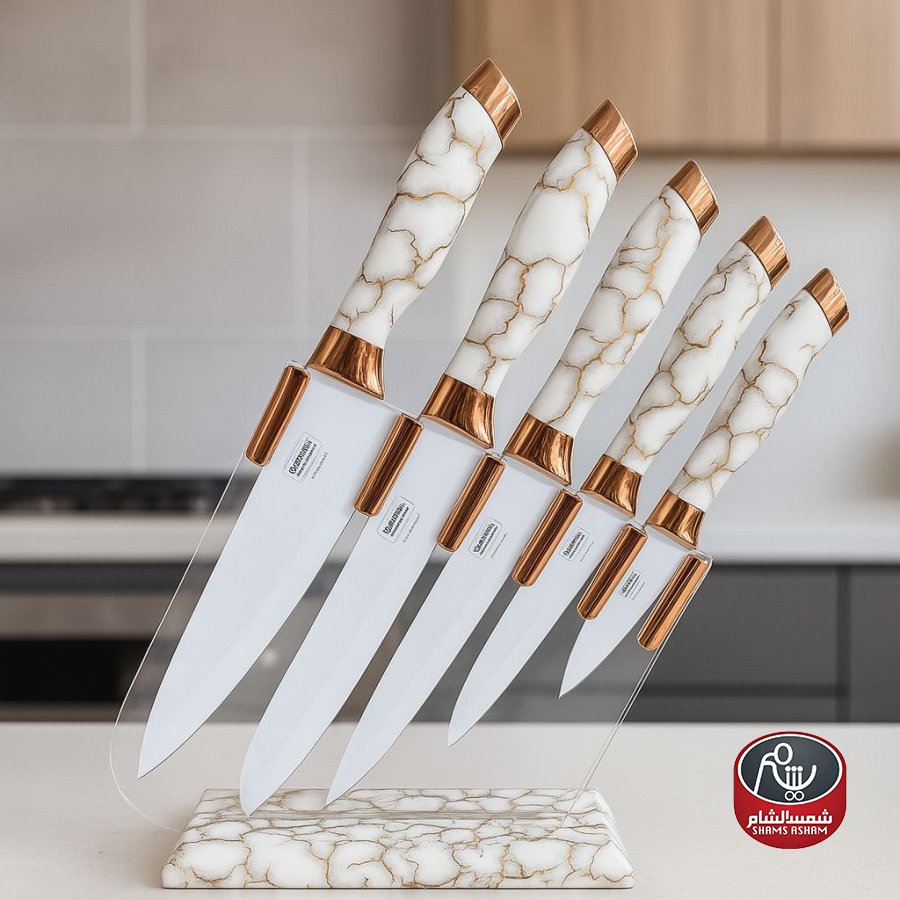 طقم سكاكين فاخر بتصميم رخامي أنيق ولمسات نحاسية لامعة، يحتوي على 6 قطع متنوعة لتلبية جميع احتياجات المطبخ. الشفرات مصنوعة من مادة قوية توفر أداء قطع دقيق وسلس، والمقابض مريحة وآمنة في الاستخدام. يأتي مع حامل رخامي أنيق يحافظ على تنظيم السكاكين ويضفي لمسة جمالية على المطبخ. مثالي للطبخ اليومي ولمن يبحث عن مزيج من الجودة والفخامة.