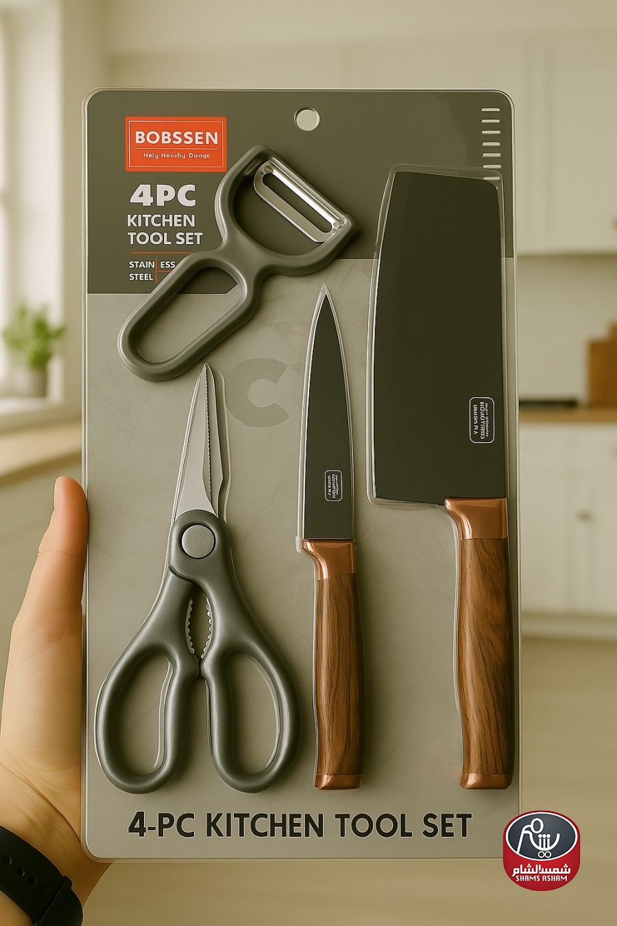 طقم أدوات مطبخ مكوّن من أربع قطع أساسية تشمل مقص مطبخي، مقشرة، سكين تقطيع، وساطور. يتميز بتصميم عملي يوفّر راحة في الاستخدام، وشفرات حادة مصنوعة من مواد مقاومة للصدأ تضمن أداءً ممتازاً في المهام اليومية داخل المطبخ. مثالي لتحضير مختلف أنواع الأطعمة بدقة وسهولة.
