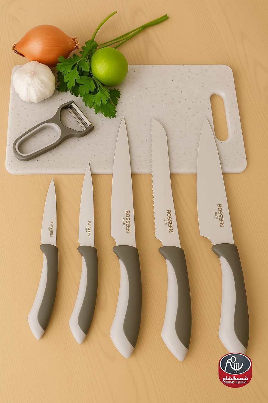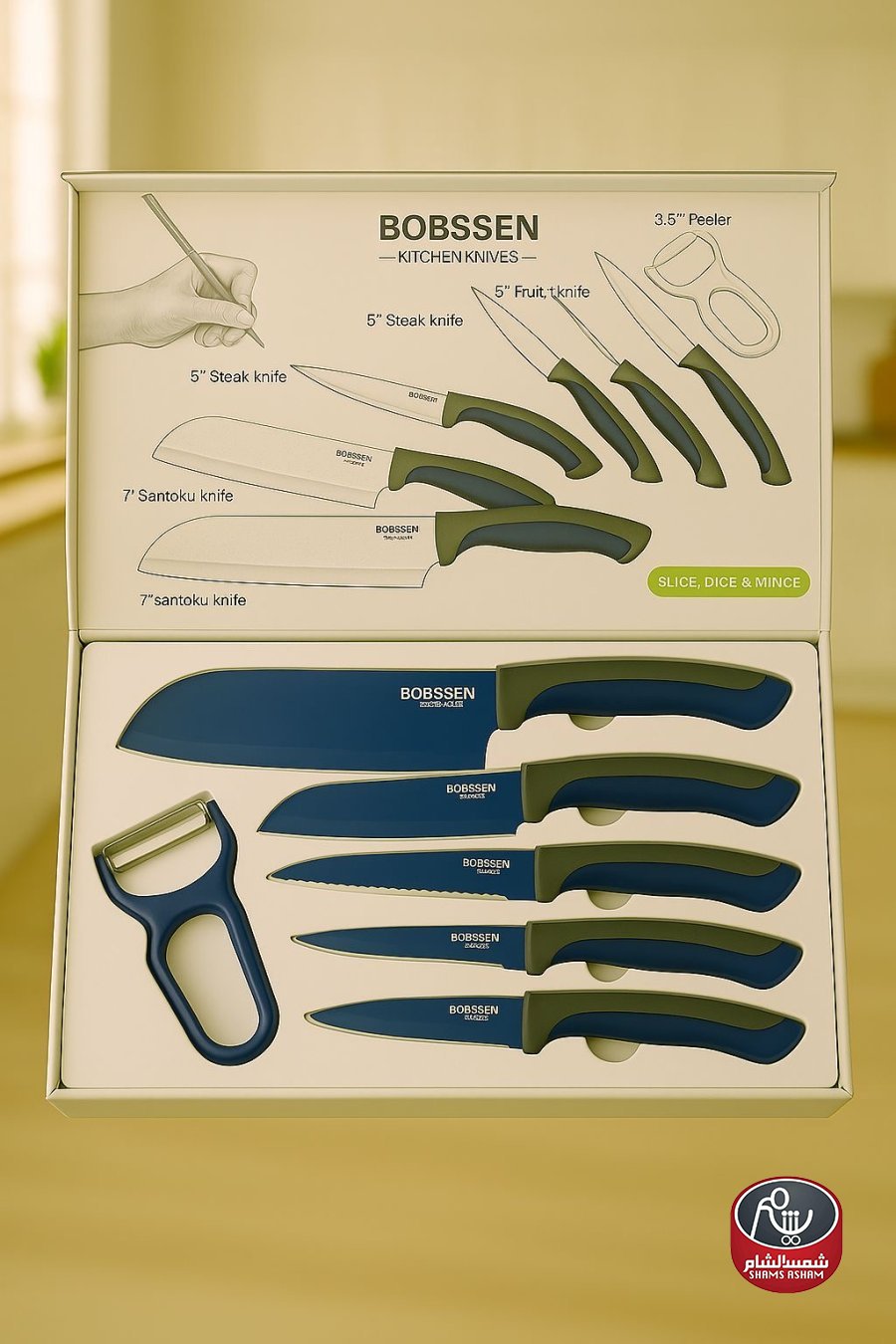 طقم سكاكين مطبخي متكامل من BOBSSEN يضم مجموعة متنوعة من الأدوات الأساسية تشمل سكاكين للستيك، الفواكه، سانتوكو، وسكين مسنن، بالإضافة إلى مقشرة عملية. مصمم ليوفّر أداء عالي الكفاءة لتقطيع وتقطير وفرم المكونات بسهولة ودقة، مع مقابض مريحة للاستخدام الآمن والثابت. مثالي للاستخدام اليومي في المطبخ المنزلي أو المهني.
