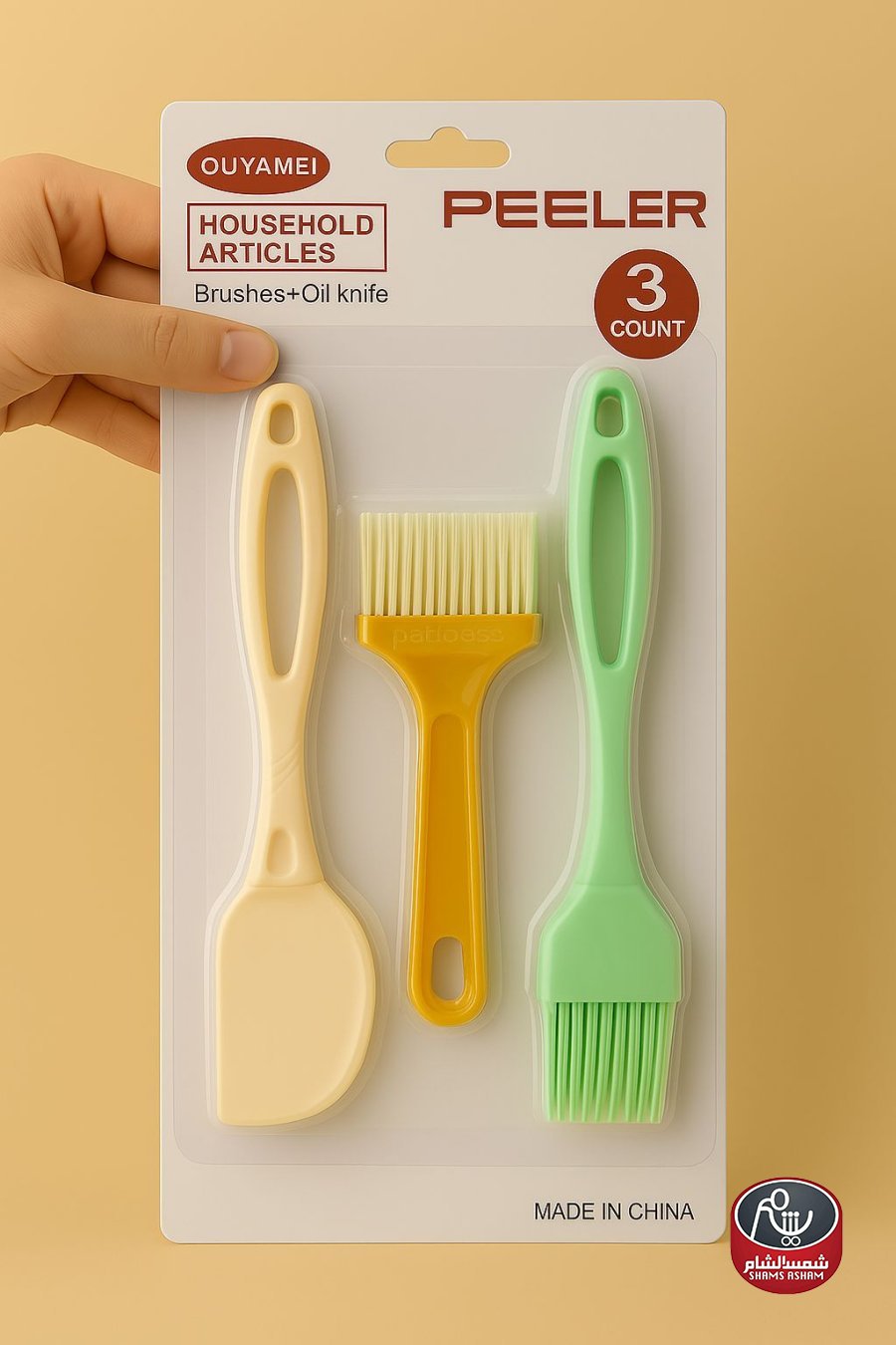 طقم أدوات مطبخ مكون من ثلاث قطع عملية: فرشاة دهن، ملعقة مسطحة، وأداة كشط. مصممة بمقابض مريحة من البلاستيك، وتُستخدم للتحضير والطبخ اليومي بسهولة. مثالي للمخبوزات أو الطهي أو توزيع الصلصات والزيوت على الأطعمة