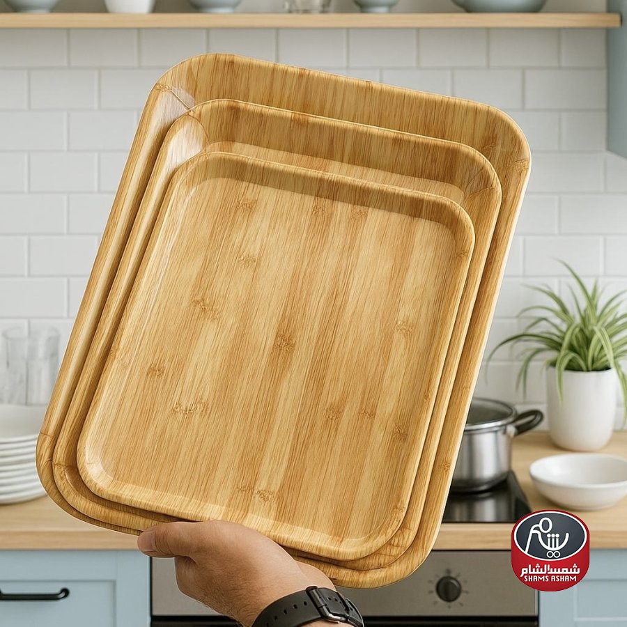 صواني تقديم مصنوعة من خامة الميلامين بتصميم أنيق يشبه الخشب الطبيعي، عملية ومناسبة للاستخدام اليومي. يتوفر ثلاث مقاسات: الحجم الصغير 33×26 سم، والحجم الوسط 39×30 سم، والحجم الكبير 44×32 سم، ما يجعلها مثالية لتقديم المشروبات أو الحلويات أو ترتيب الأدوات في المطبخ.