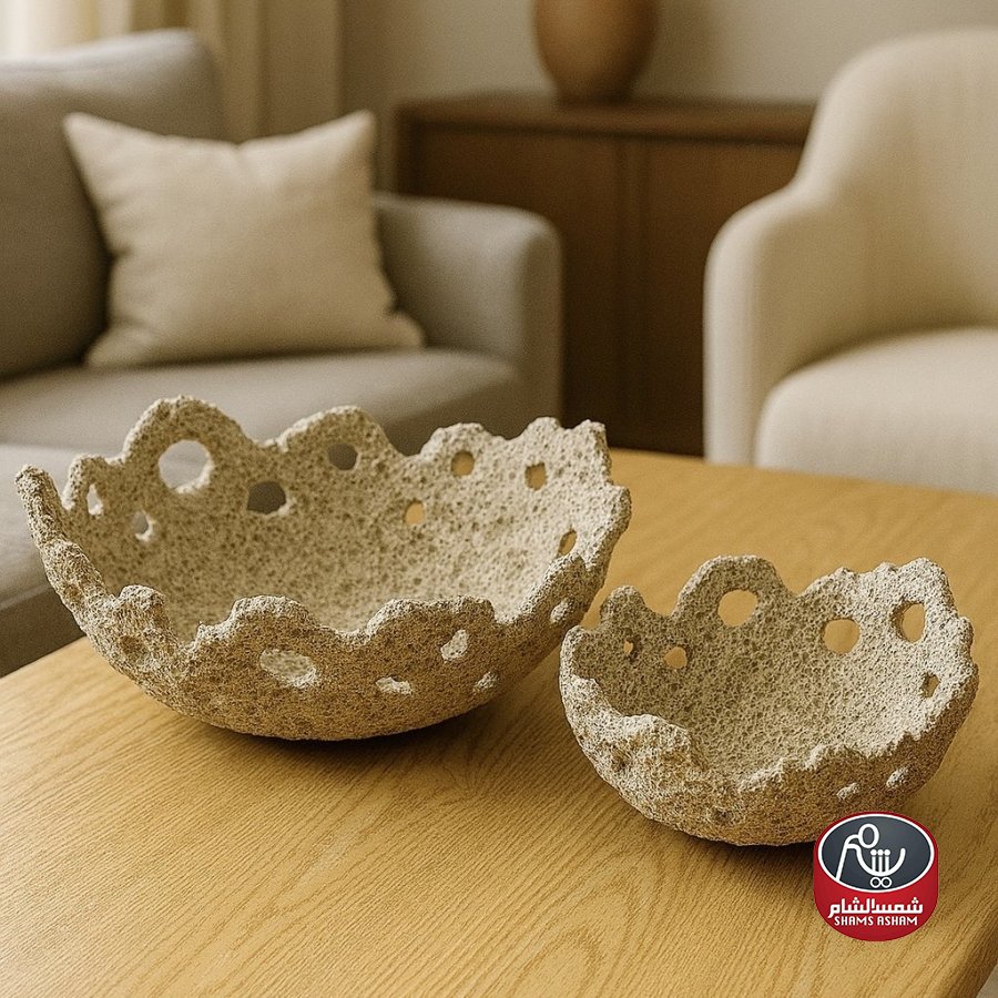 طقم مكون من قطعتين بتصميم عضوي مستوحى من الصخور البركانية، يتميز بقوام خشن وثقوب عشوائية تضيف لمسة فنية فريدة. يأتي بقطرين مختلفين: القطعة الصغيرة بقطر 20 سم، والقطعة الكبيرة بقطر 30 سم، مما يجعله مناسباً للتزيين أو الاستخدام كجاط تقديم مميز في المساحات العصرية والطبيعية. تصميمه النحتي يجعله قطعة ملفتة للنظر سواء استُخدمت وحدها أو ضمن تنسيق ديكوري.
