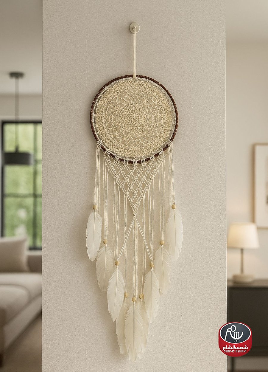 ديكور حائط على شكل دريم كاتشر (Dreamcatcher) بتصميم يدوي أنيق، مصنوع من خيوط قطنية مضفورة بدقة داخل دائرة قطرها 25×25 سم، ويتدلّى منه شراشيب طويلة يصل طولها الكامل إلى 90 سم، مزينة بريش ناعم وخرز خشبي صغير. يضفي لمسة بوهيمية دافئة ومميزة على غرف النوم أو المداخل أو زوايا الجلوس. مثالي لعشّاق الديكورات الهادئة والطبيعية