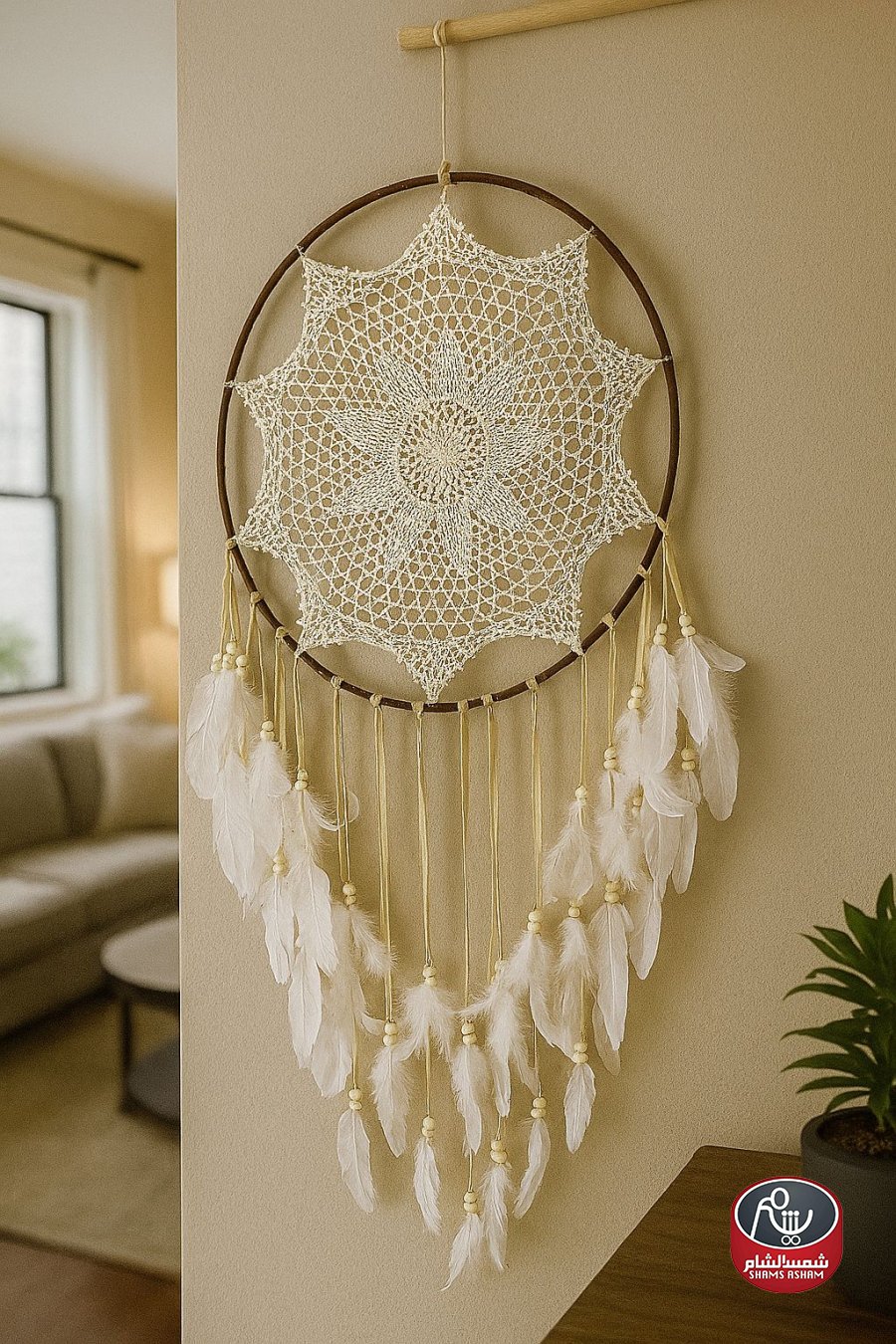 ديكور حائط مميز على شكل دريم كاتشر كبير، بقطر 40×40 سم وطول كلي 110 سم، يتميز بتصميم شبكي يدوي على شكل زهرة في المنتصف، مصنوع من خيوط قطنية بلون طبيعي داخل إطار خشبي أنيق. تتدلّى منه خيوط طويلة مزينة بريش ناعم وخرز خشبي، تضفي لمسة فنية دافئة على الجدران. مثالي لتزيين غرف النوم أو الزوايا الهادئة بأسلوب بوهيمي راقٍ.