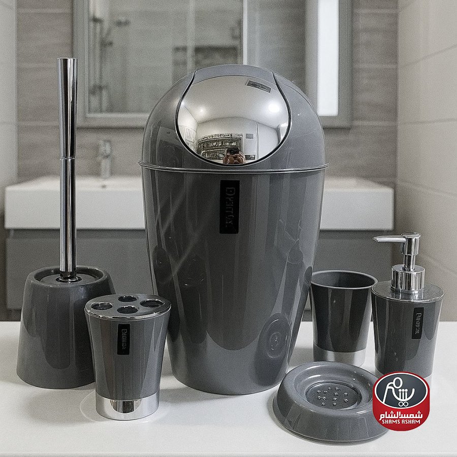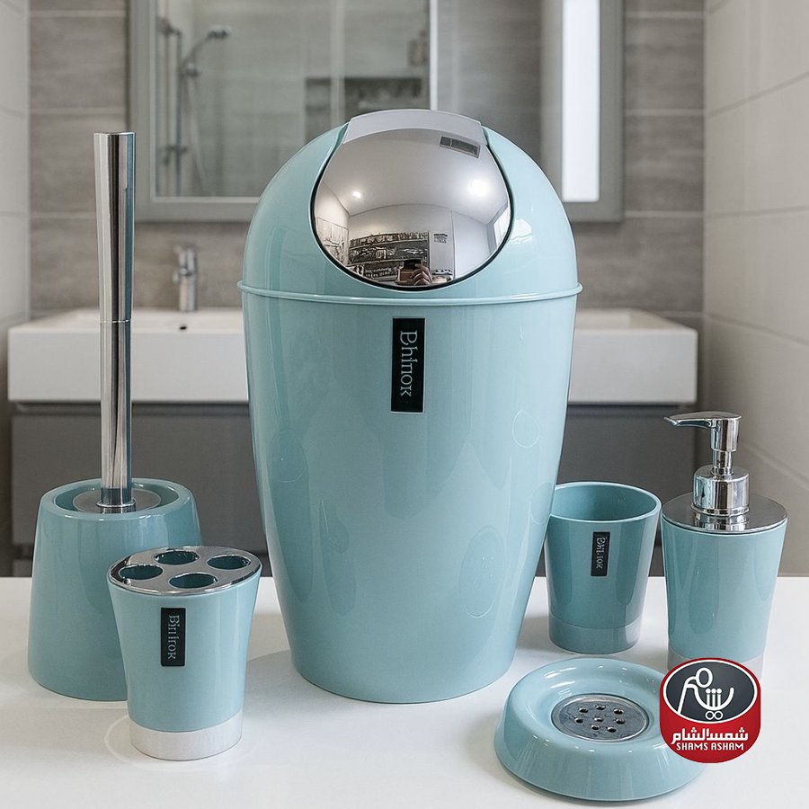 طقم حمام عصري مكوّن من 6 قطع متناسقة تشمل سلة نفايات، موزع صابون، حاملة فرشاة، كوب، صحن صابون، وفرشاة مرحاض. تصميم أنيق بلمسة لامعة، متوفر بلونين جذابين ليناسب مختلف ديكورات الحمام.
