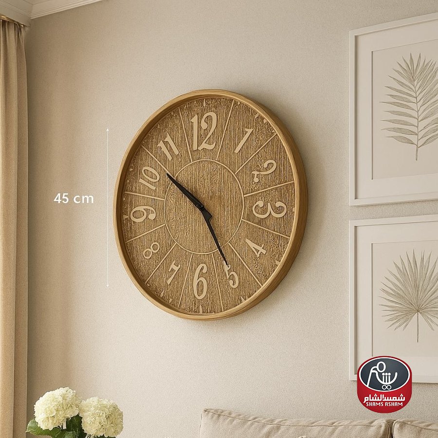 ساعة حائط دائرية بقطر 45 سم، بتصميم خشبي أنيق يضفي لمسة دافئة وعصرية على الجدار. تتميز بأرقام بارزة كبيرة لسهولة القراءة، مع عقارب سوداء دقيقة تضيف تبايناً جميلاً. مثالية لغرف المعيشة أو المكاتب أو الممرات، وتجمع بين الجمالية الكلاسيكية والعملية اليومية